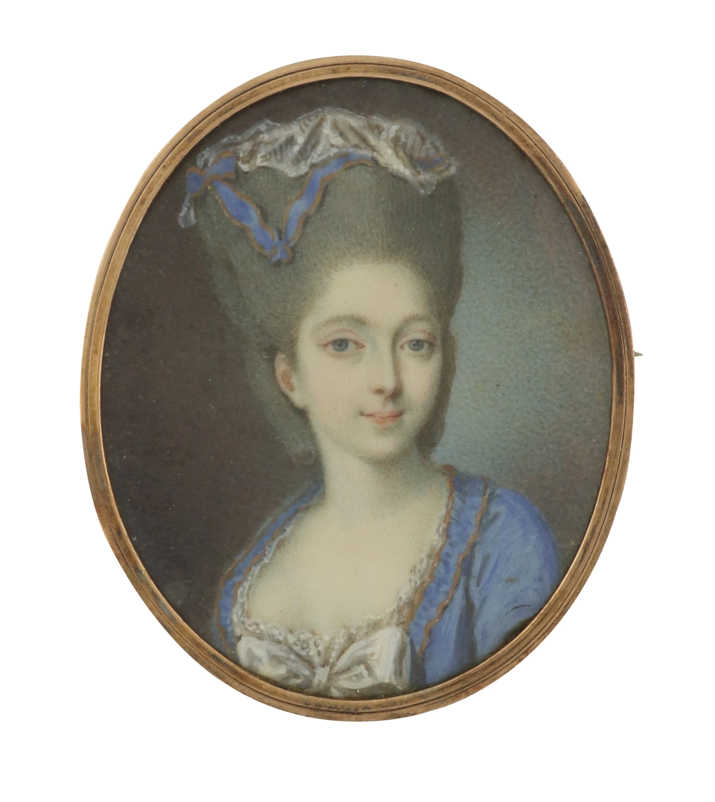 Portrait miniature of a young lady, wearing a blue dress, and lace cap with blue ribbon