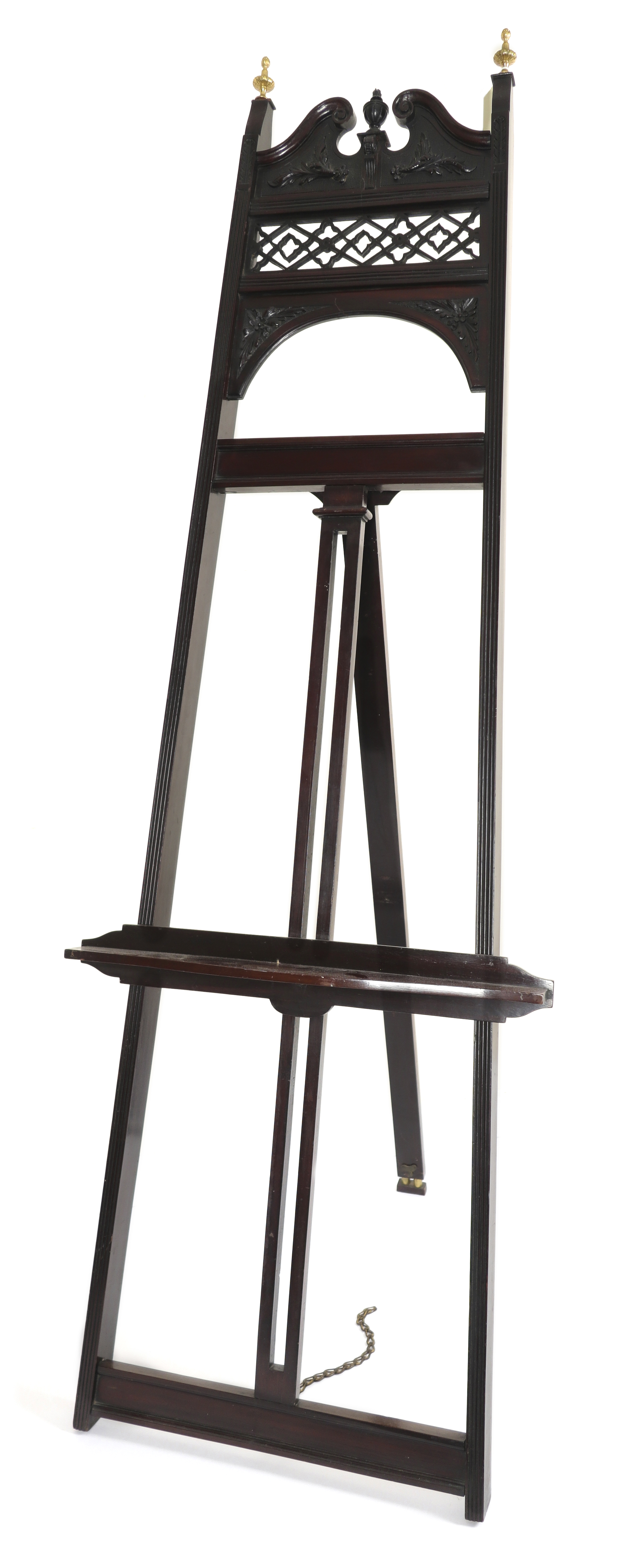 A 20th Century Mahogany Easel With fluted supports surmounted with gilt finials and swan neck...