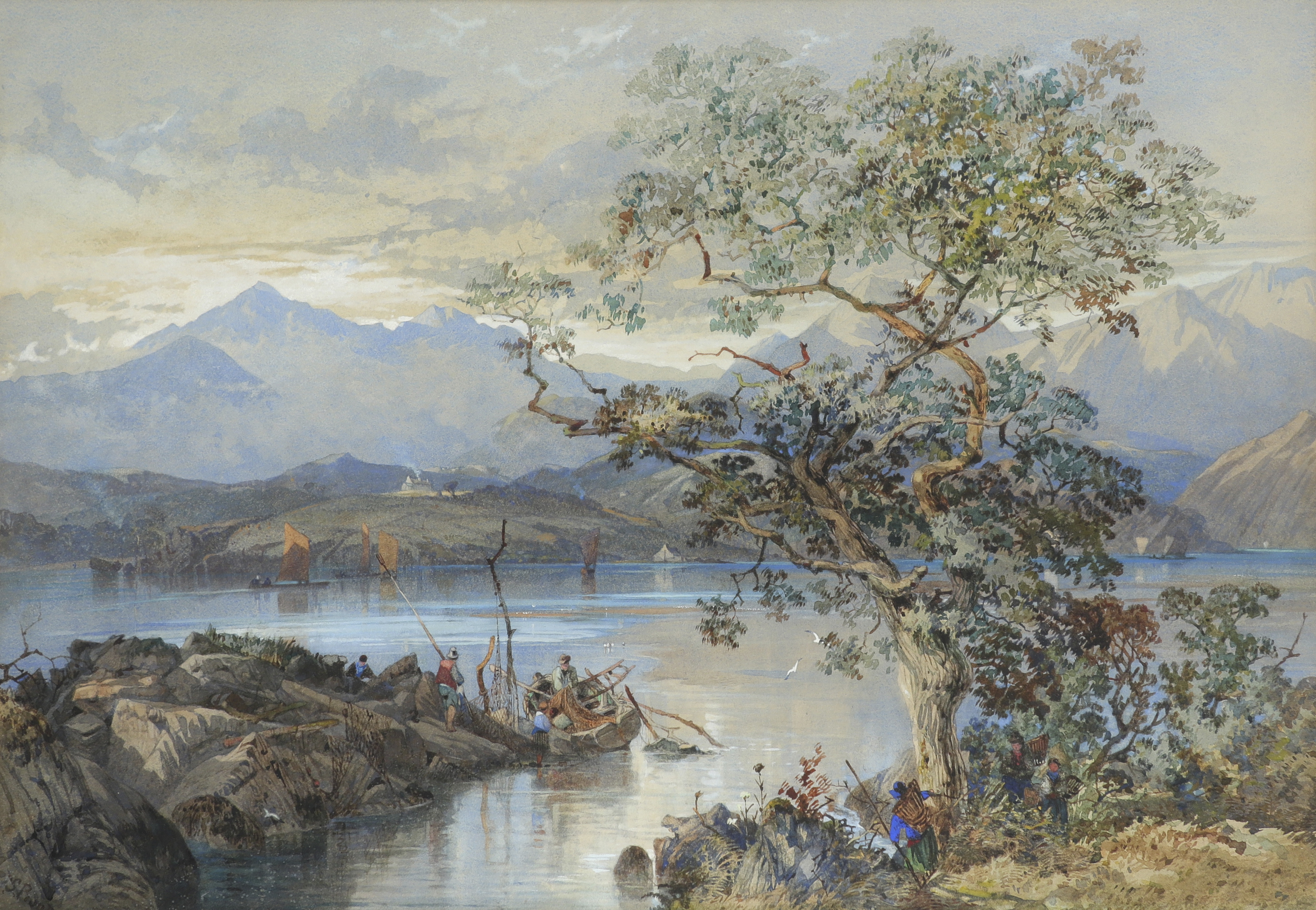 Samuel Prout OWS (1783-1852) Mountainous river landscape with figures tending to fishing nets and...