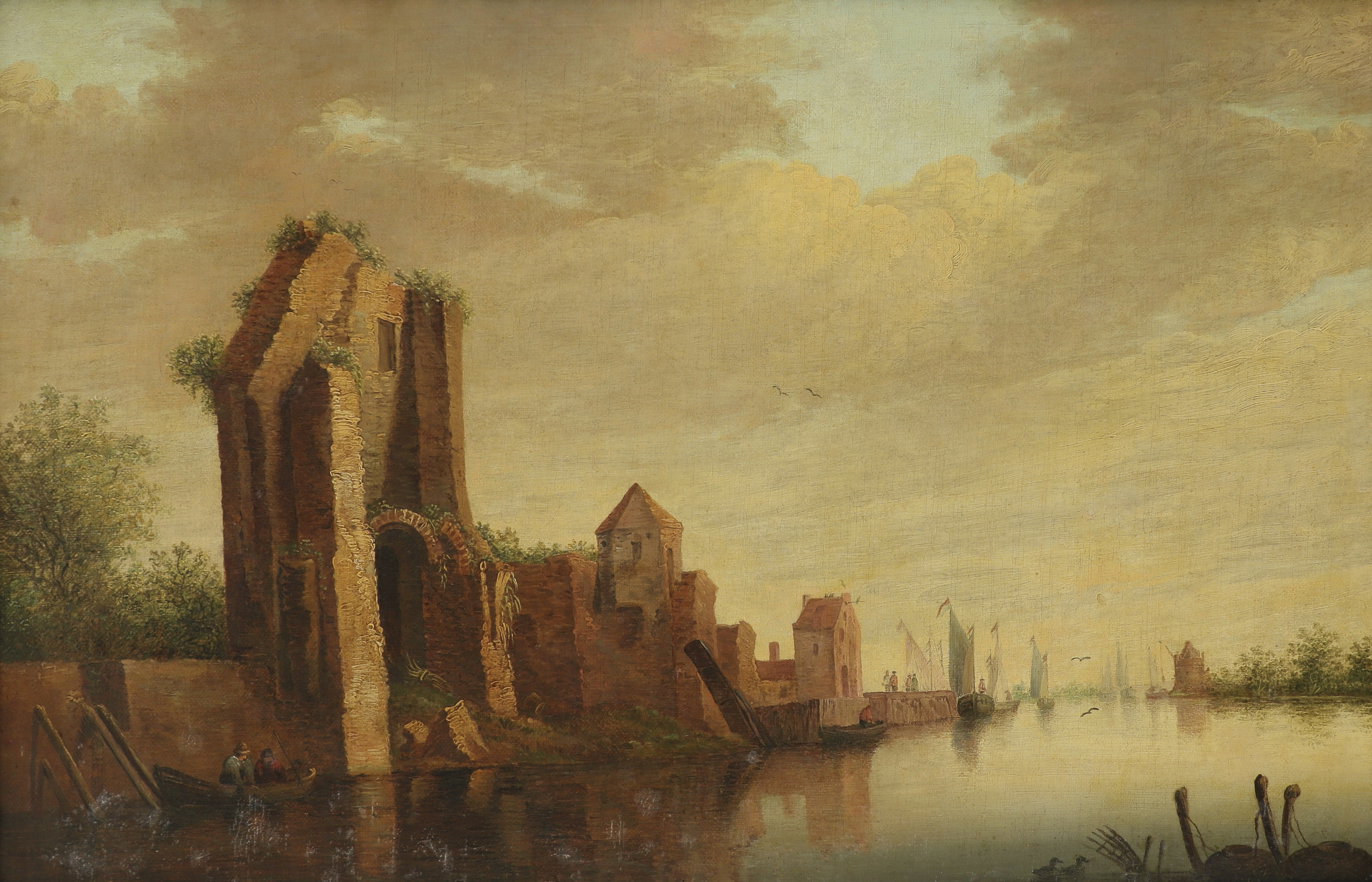 River landscape with fishermen drawing in their nets underneath a ruined tower