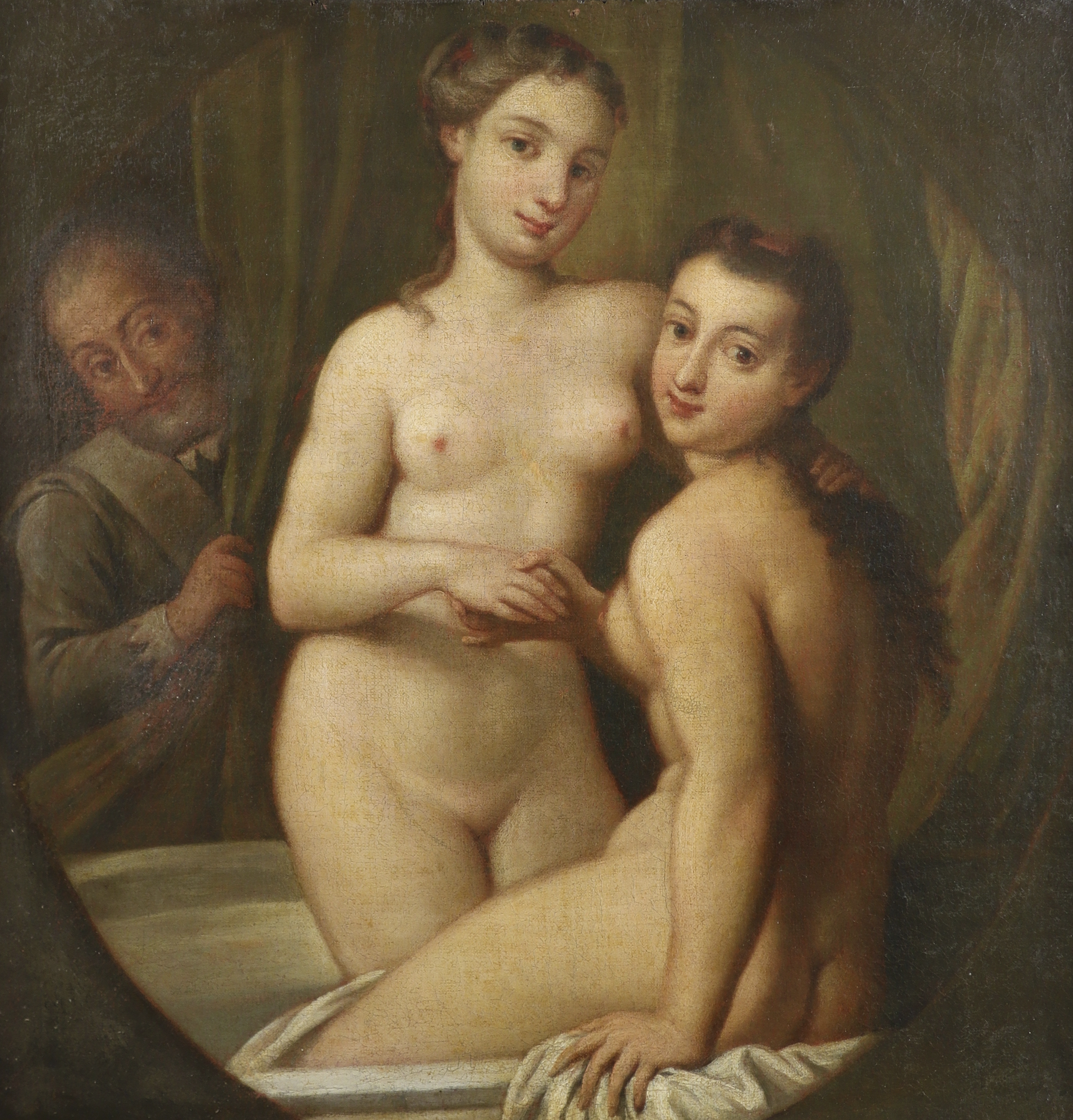 French School 18th Century Two nudes with a gentleman voyeur Oil on canvas in a painted cartouche...