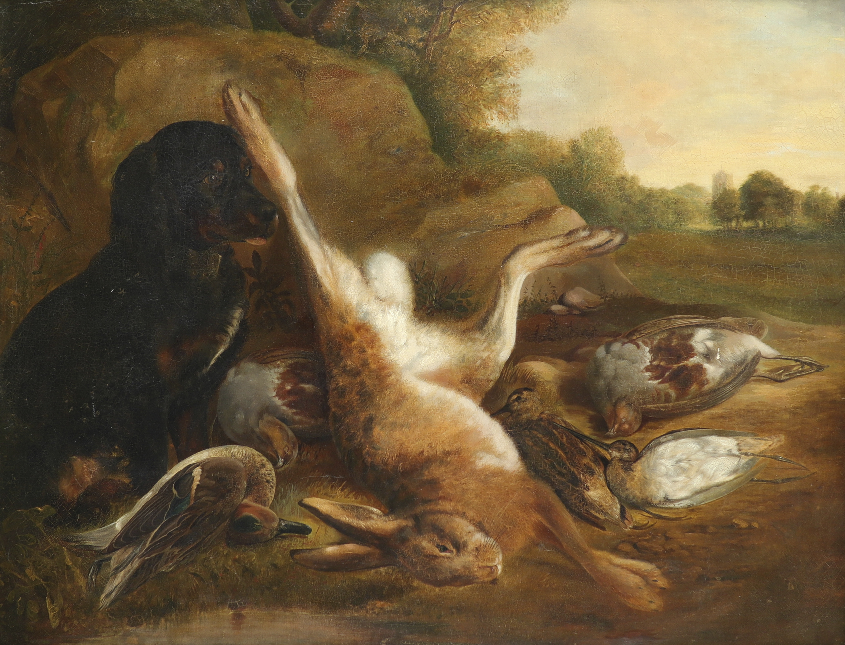 Circle of Jan Weenix Still life with a dog watching over a dead hare and other game Oil on canvas...