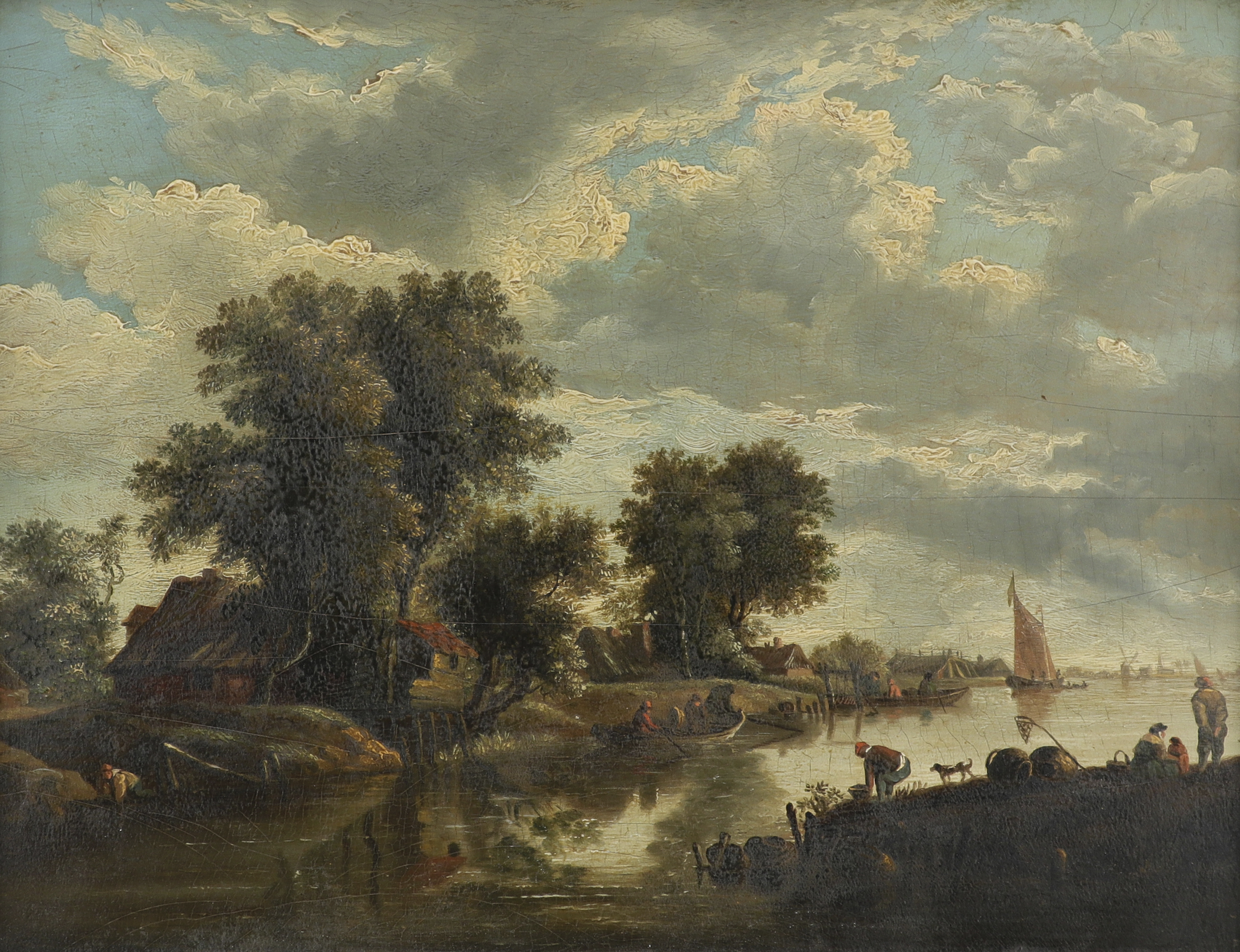 Dutch School 18th Century River landscape with figures fishing and boating Oil on panel 32.8 x...