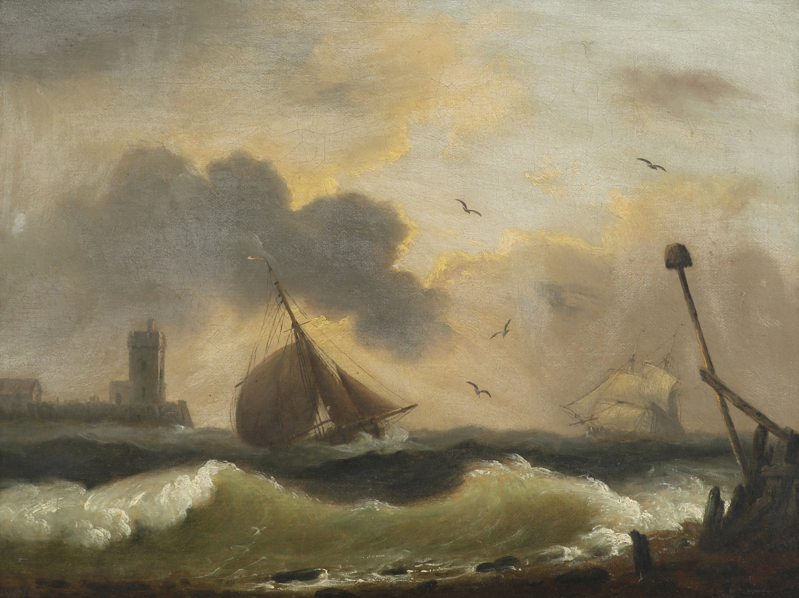 Thomas Luny (1759-1837) Ships in choppy coastal waters Signed and dated 1818 Oil on canvas 25.8 x...
