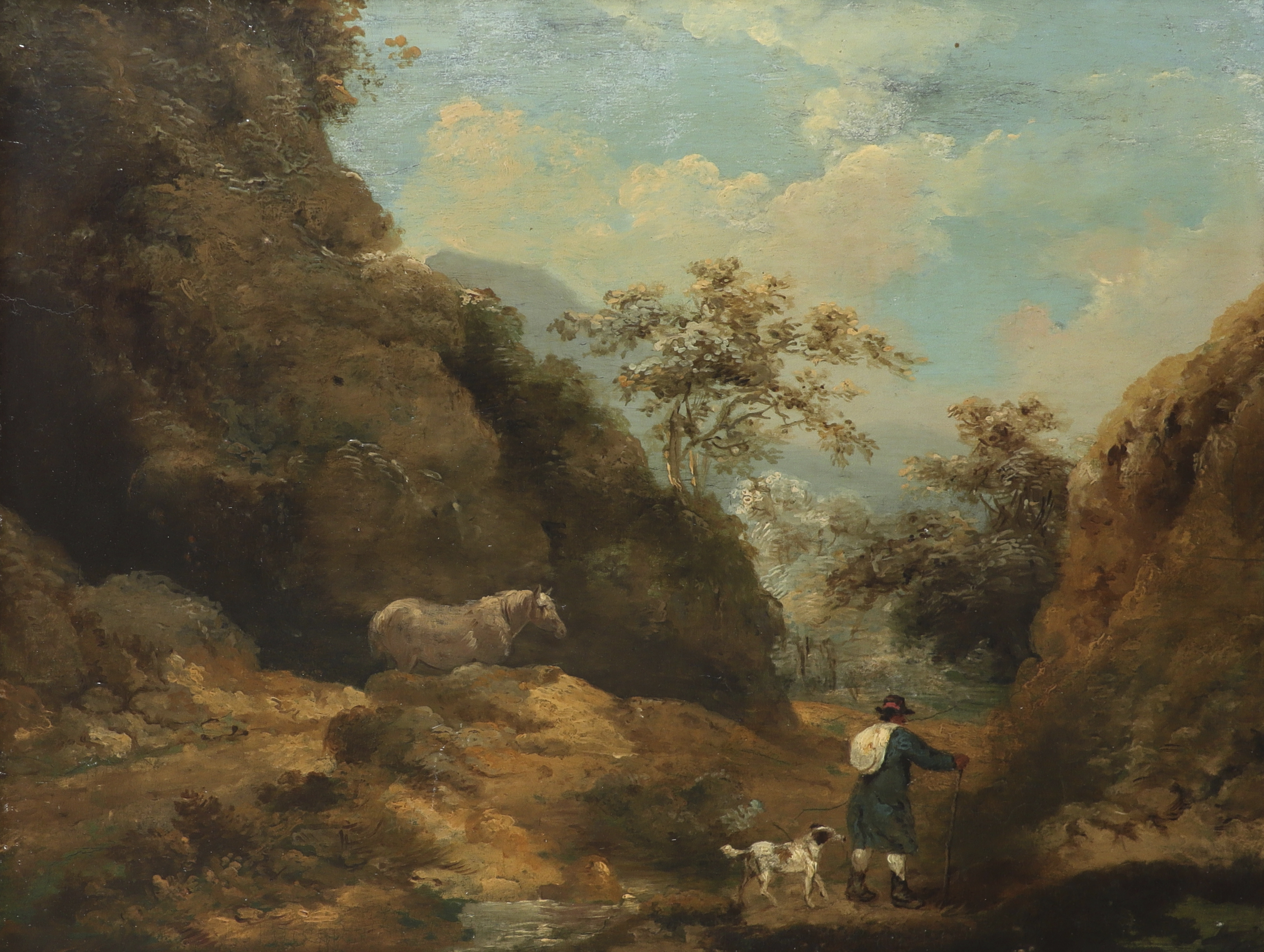 Attributed to George Morland (1763-1804) A traveller on the road with his horse and dog Oil on...