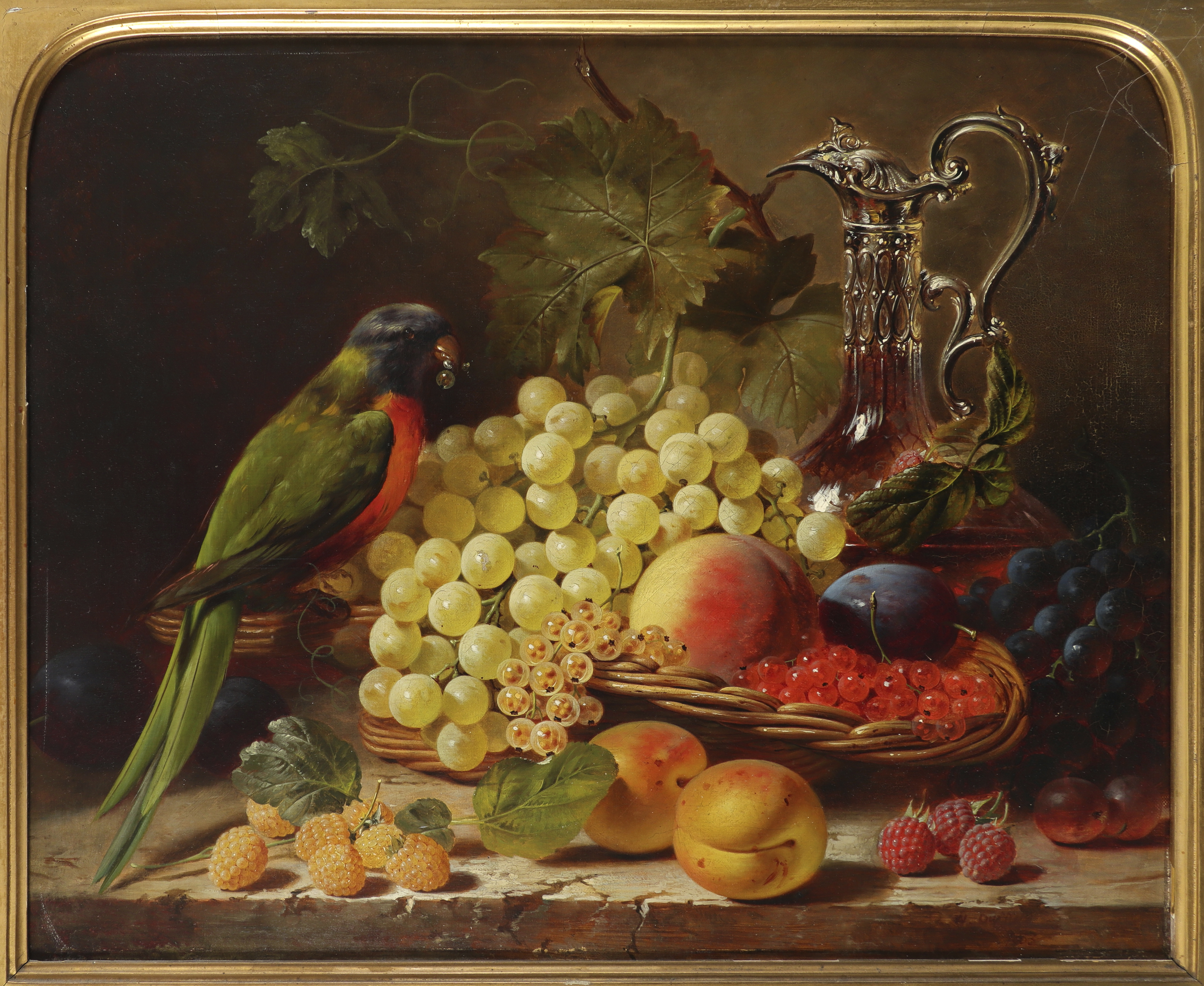 Still life with fruit in a basket, parrot and claret jug on a stone ledge