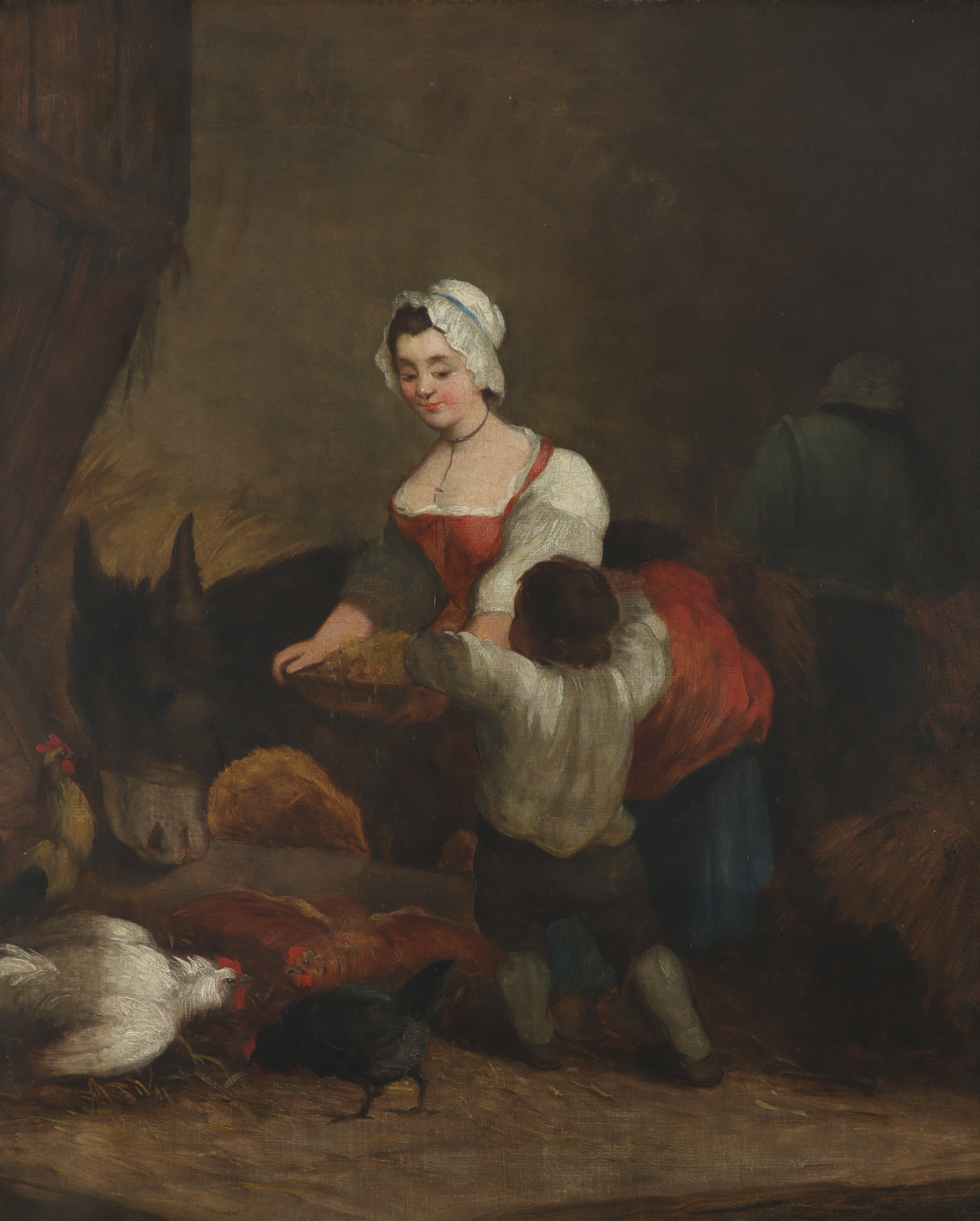 English School 19th Century A mother and child feeding chickens and a donkey in a stable Oil on...