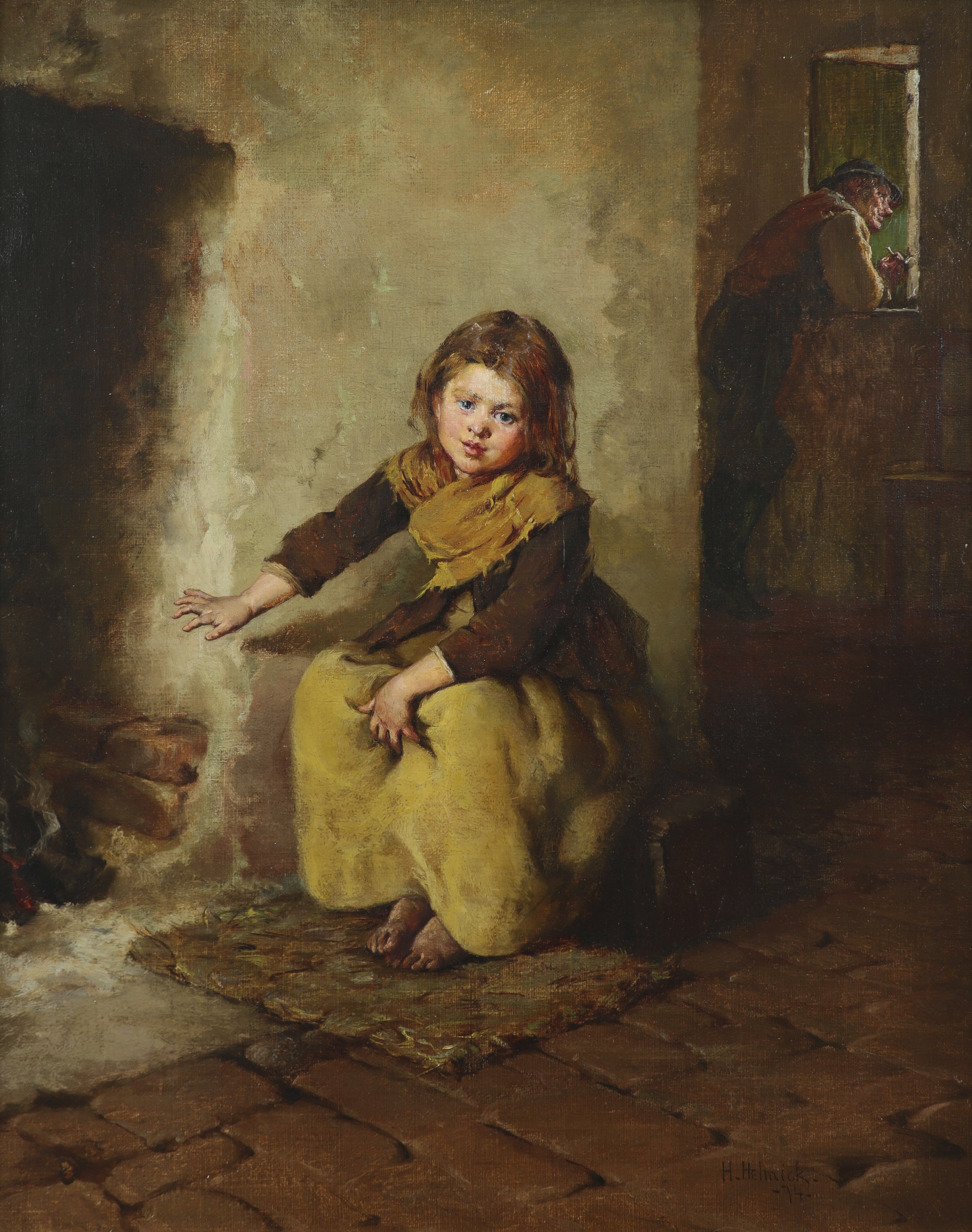 Howard Helmick (American 1845-1907) Girl by the fire Signed and dated 74 Oil on canvas 49 x 40cm;...