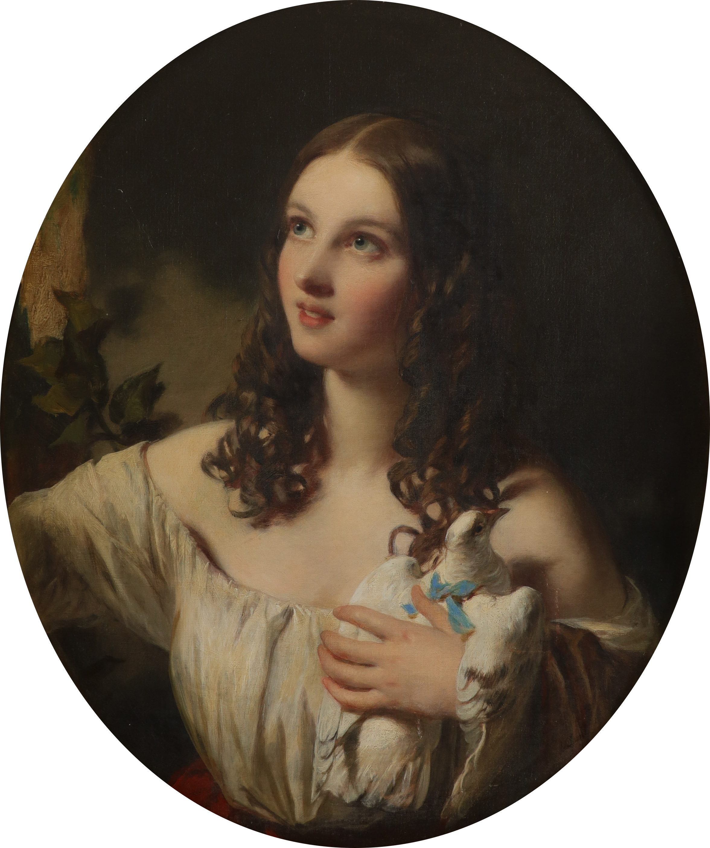 Portrait of a young girl, half-length, in a white dress and red sash holding a dove