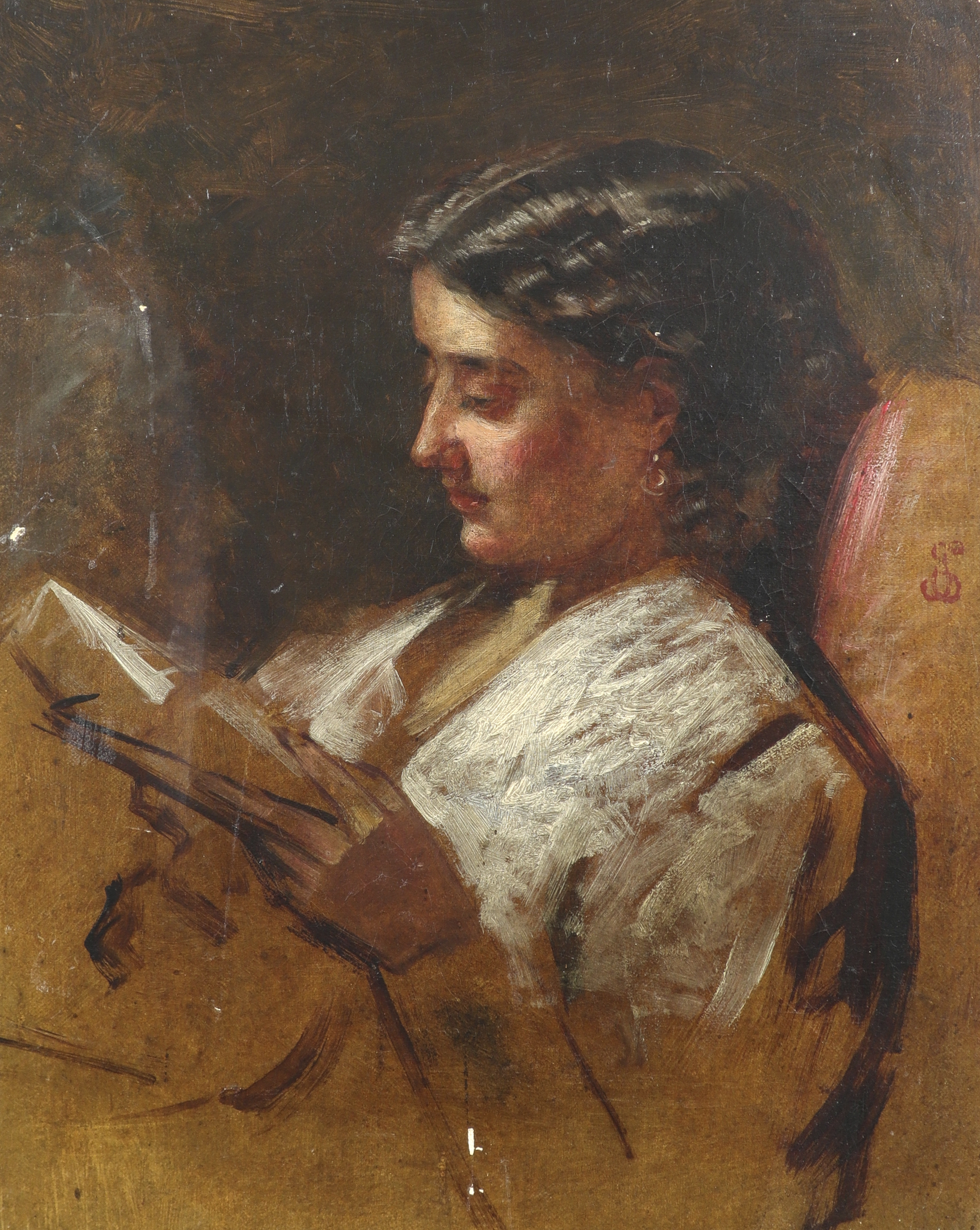 Circle of John Phillip Portrait of a girl reading Signed with monogram Oil on board 36.3 x...