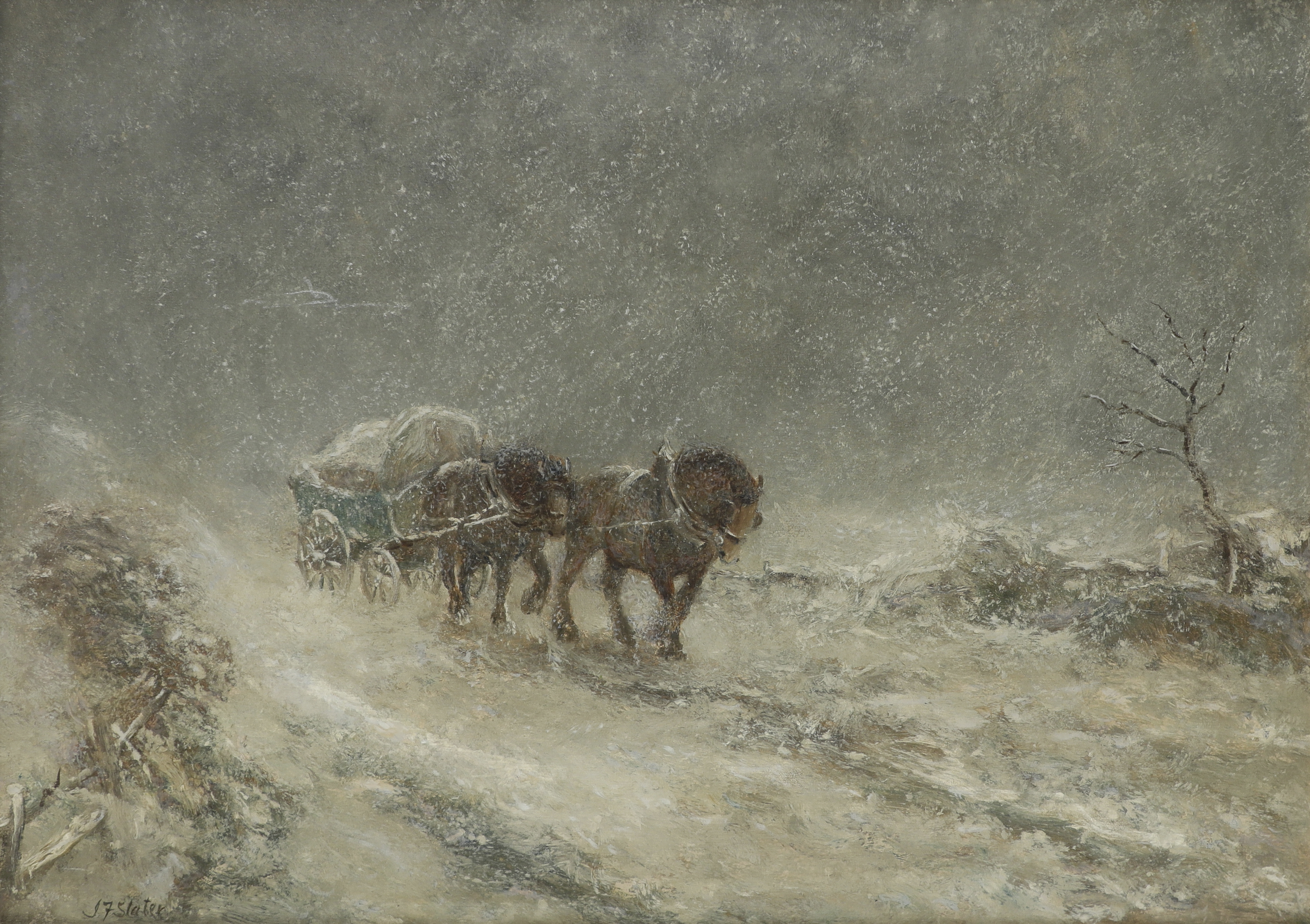 John Falconer Slater (1857-1937) A horse-drawn cart in a snow-storm Signed Oil on board 45.5 x...