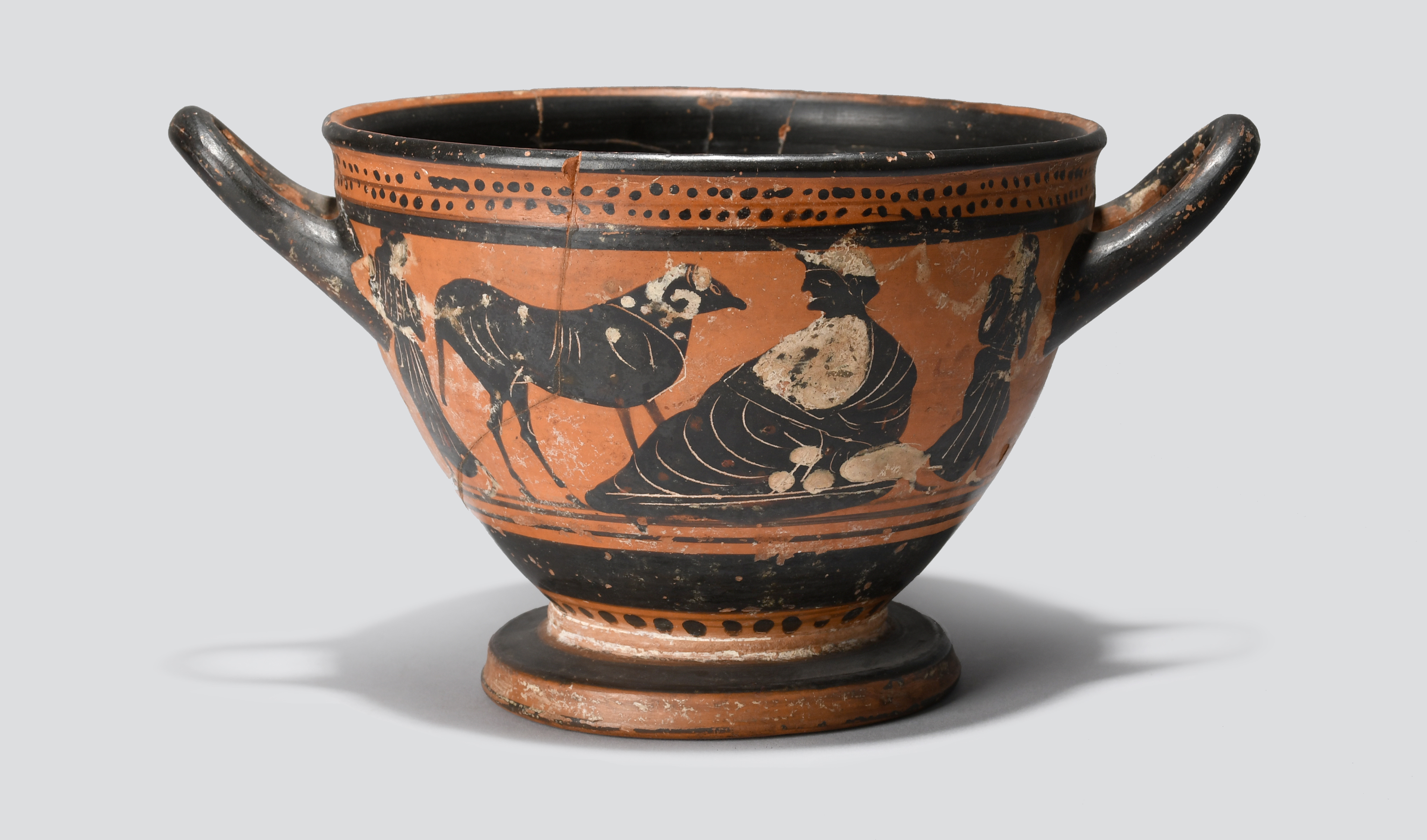 each side decorated with a seated male figure and a ram with an attendant either side, both walking away and looking backwards, a double row of dots under the rim and a single row along the foot, the base with inscribed inventory numbers 31802, CMF?, 487,