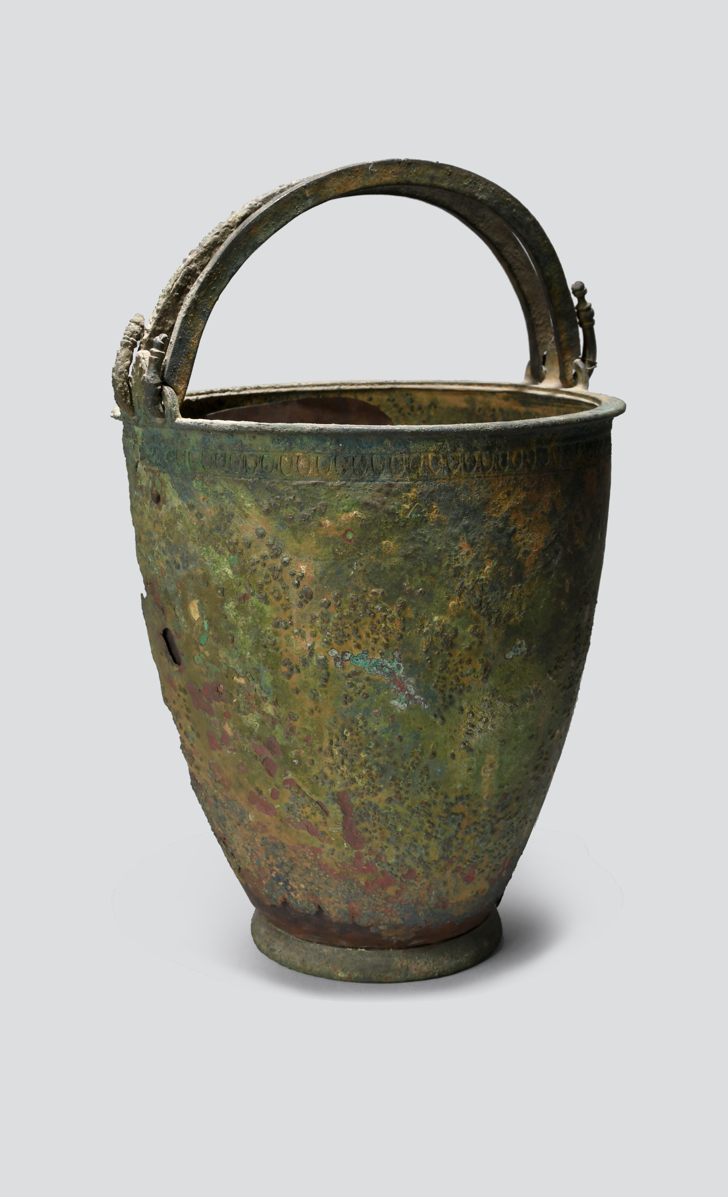 A Greek bronze situla circa 4th century BC with a circular foot and tapering cylindrical body...
