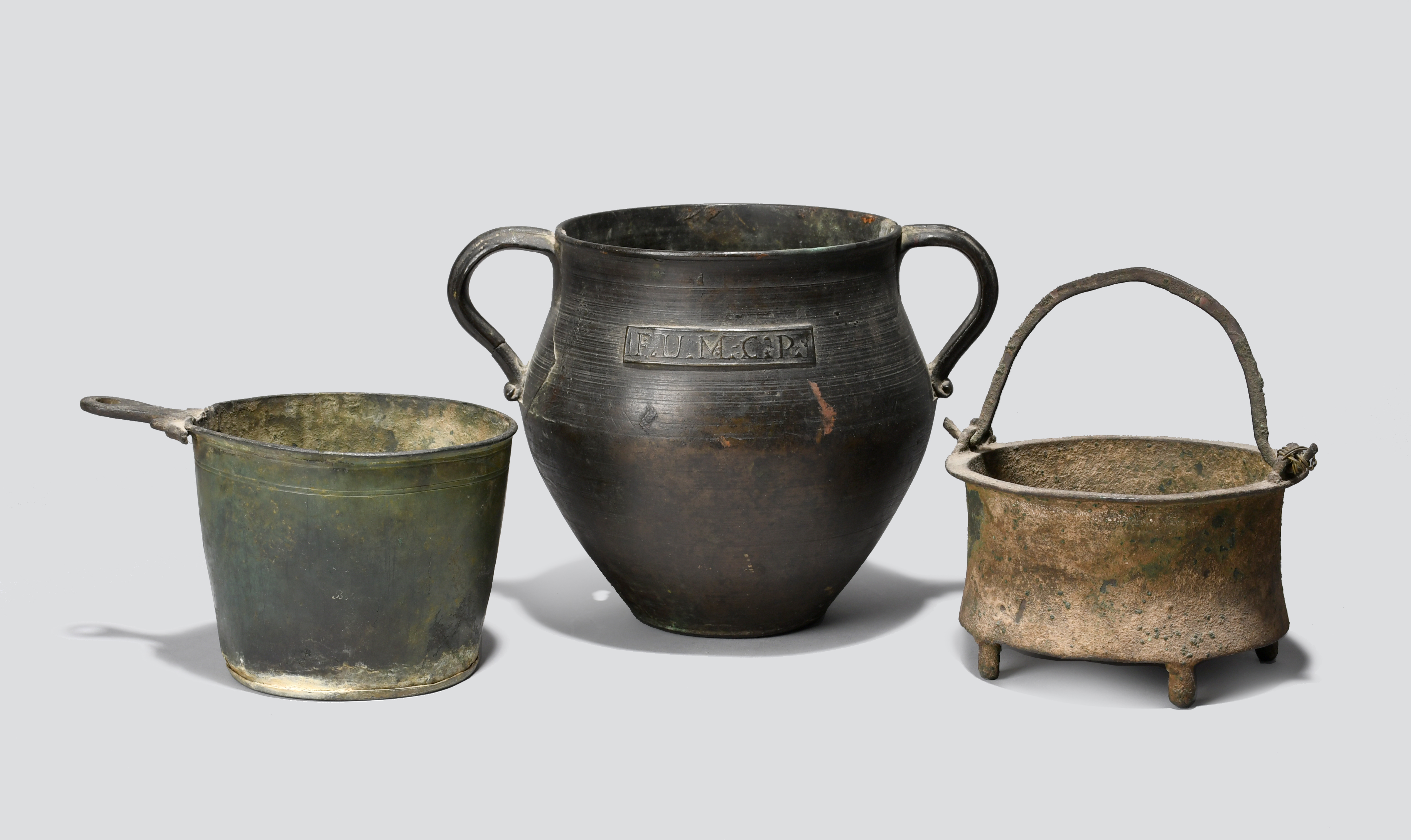 including a situla with one remaining handle, 12.5cm diameter, a pan with a short pierced handle having dolphin head terminals, the body later indistinctly inscribed Bolog.., 9.6cm high and a two handled ovoid jar, with an applied plaque cast F.U.M.C:P., 15.2cm high. (3)