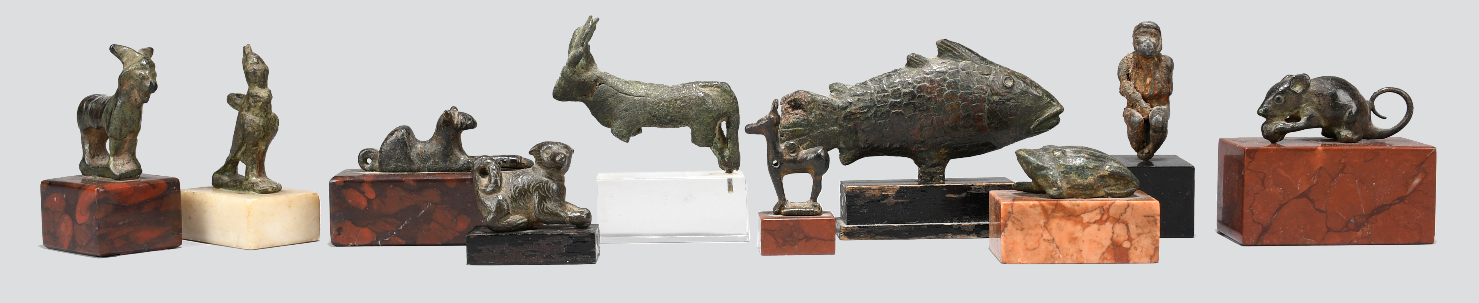 including an Apis Bull, 5.3cm long, a Horus falcon, 4.2cm high, a reclining cat, 5cm long, a toad, 3.2cm long, a fish, 8.2cm long, a goat, 3.7cm high, a deer, 3.3cm high, a baboon, 4cm high, a dog with a disc in it's front paws, 3.1cm long and a mouse with a disc shape in it's front paws, 4.2cm long, all on bases. (20)