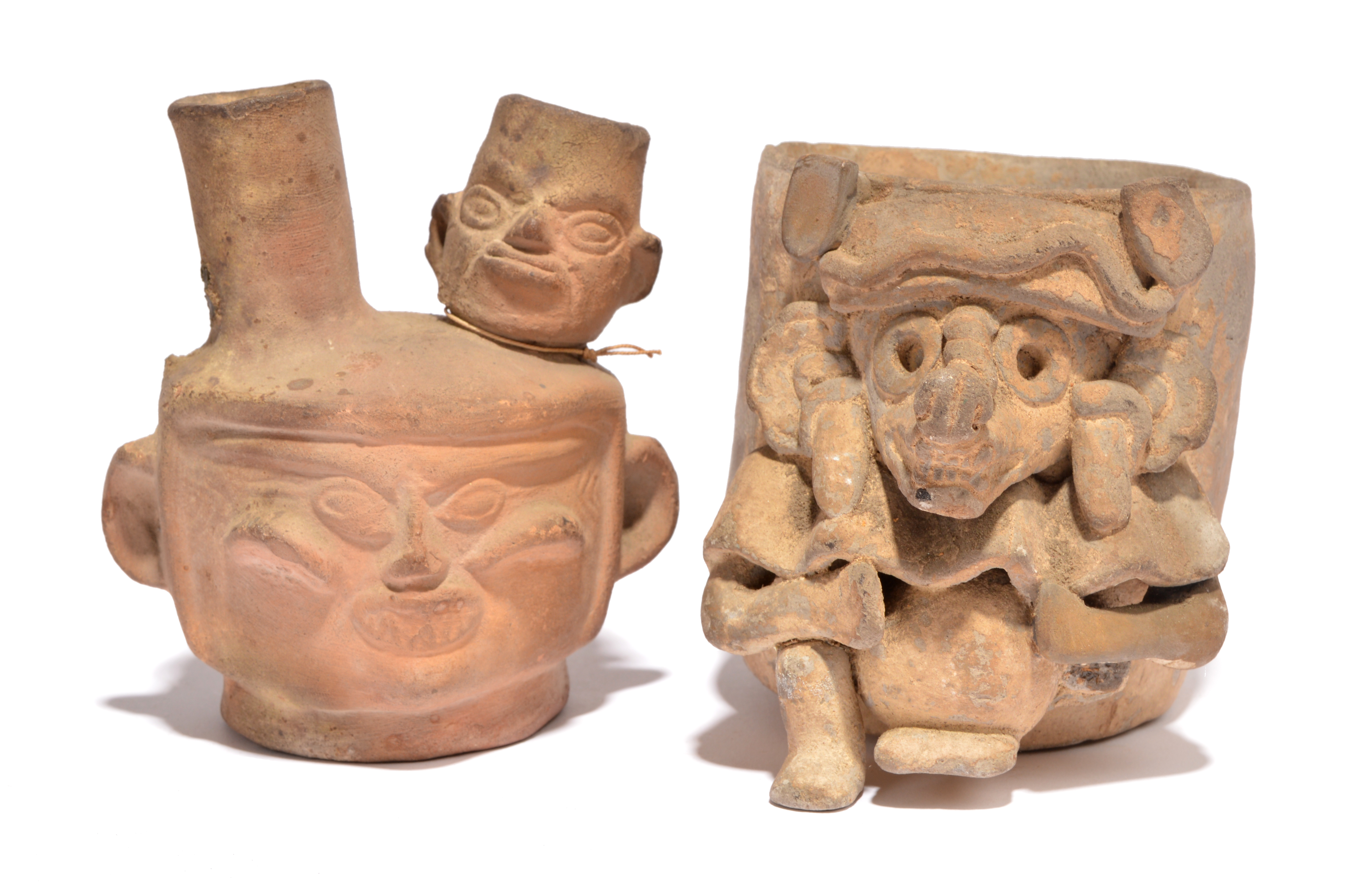 and a Peru mask double spout vessel, 12.5cm high. (2)