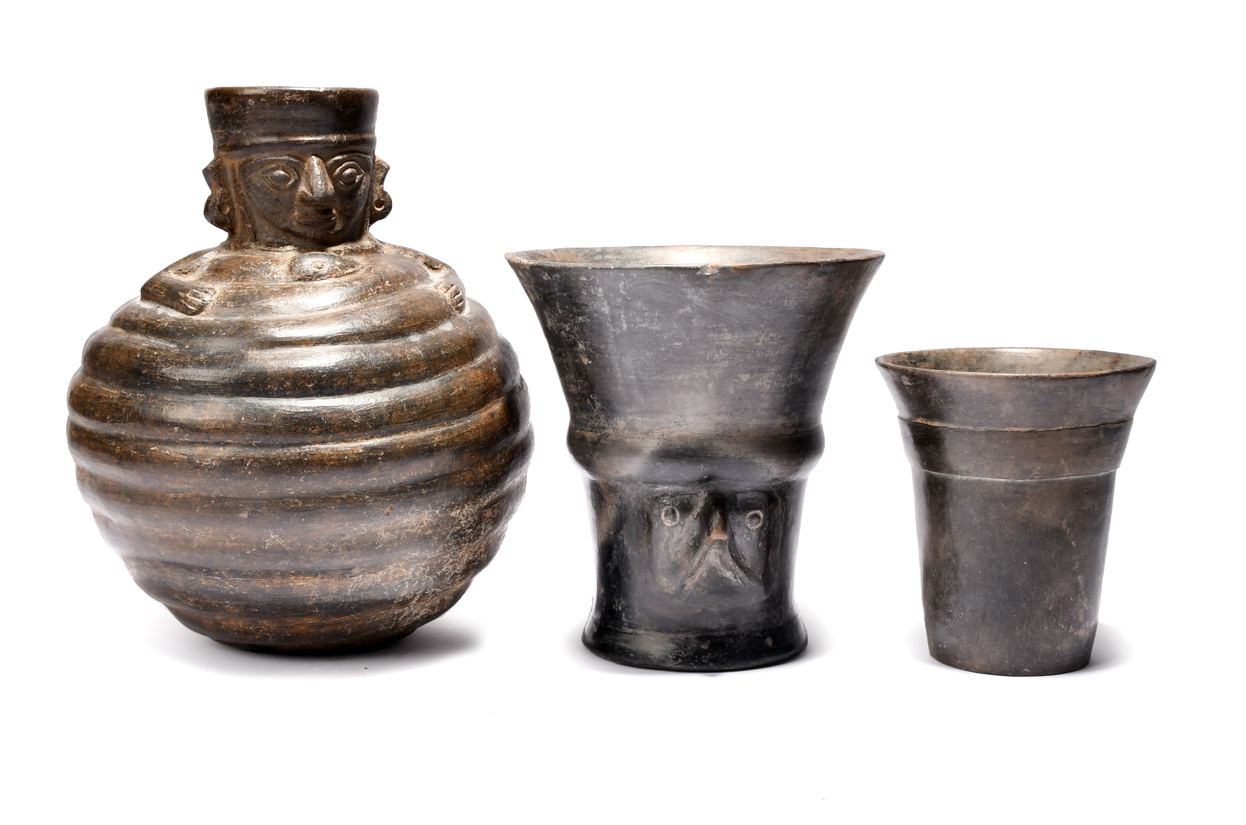 a Bolivia clay kero, 11cm high and another larger with a relief owl mask, 15cm high. (3)