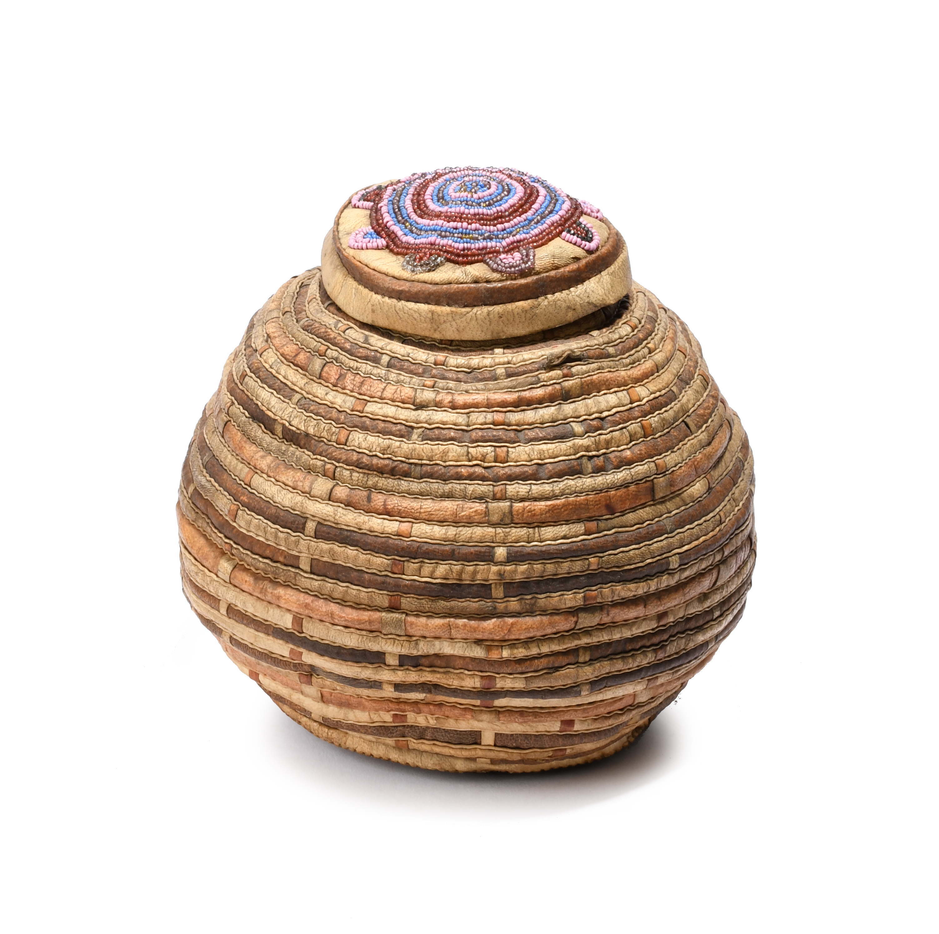 sealskin and coloured glass beads, of globular form sewn in strips of natural and tanned skin, the shoulders previously with a handle and the cover with a radiating circle design with eight semi-circles to the outer edge, with written inventory number 77 CLA 353 : A to the container and 77 CLA 353 : b to the cover, late 19th century,
