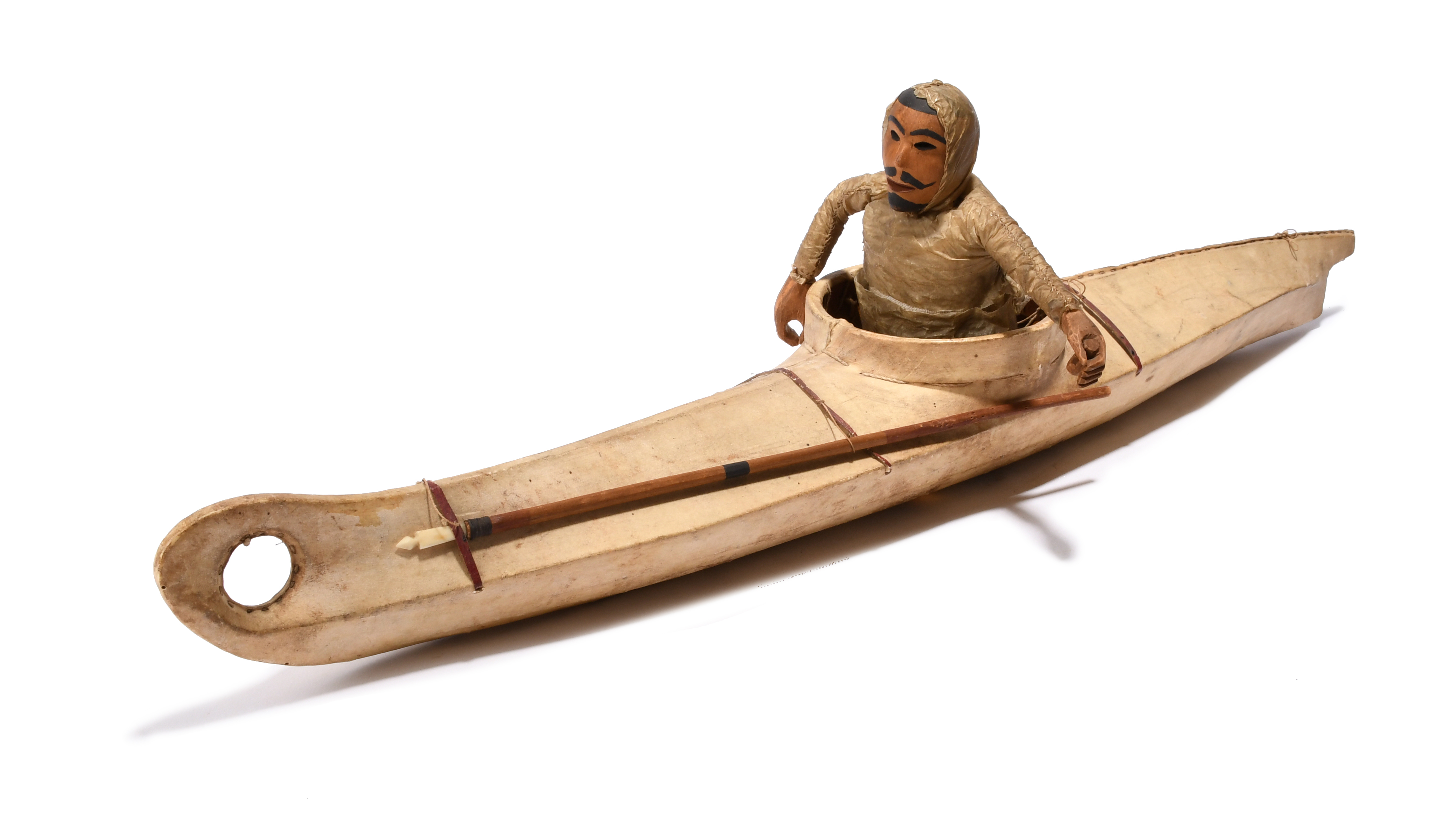 wood frame with sealskin and a half figure hunter with a carved head and hands and wearing a seal gut parka, with a marine ivory tipped harpoon, with a collection tag M. G. DERUMAUX, ALASKA SOUTH, 19th century,