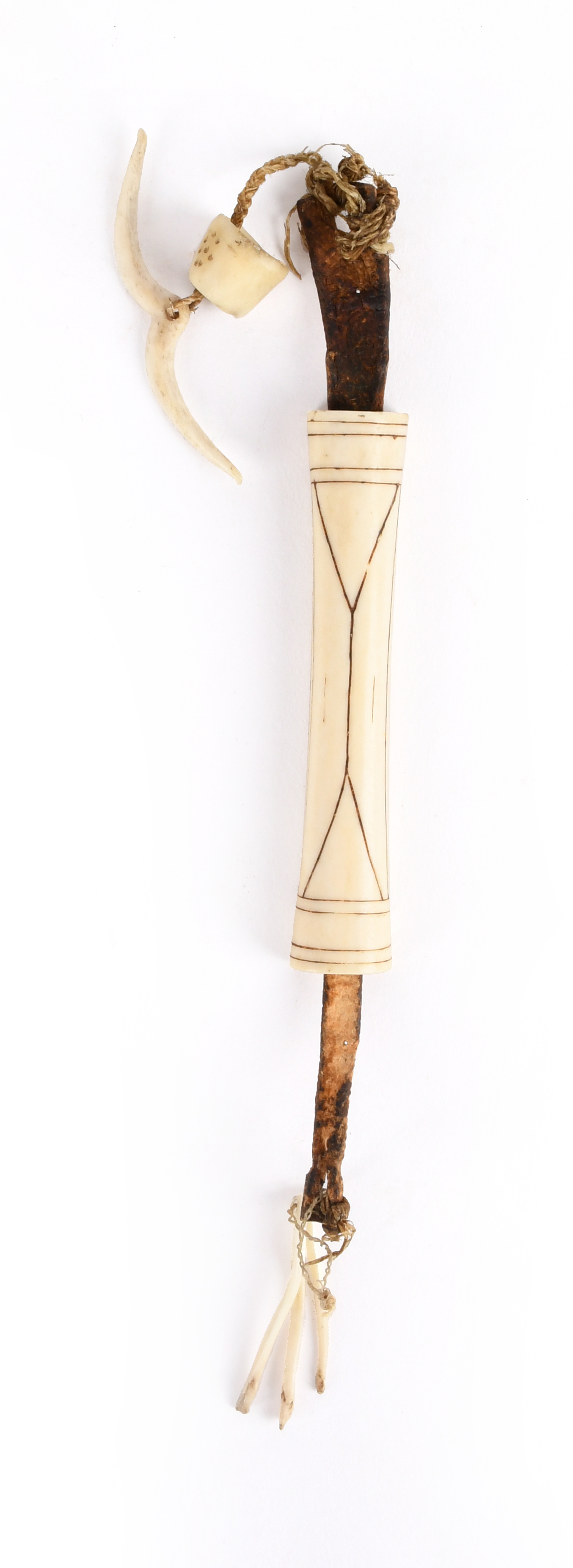 marine ivory, leather and sinew, the case with incised linear decoration, the back with inventory number 42.430, with bodkins and a thimble having eight incised dots,