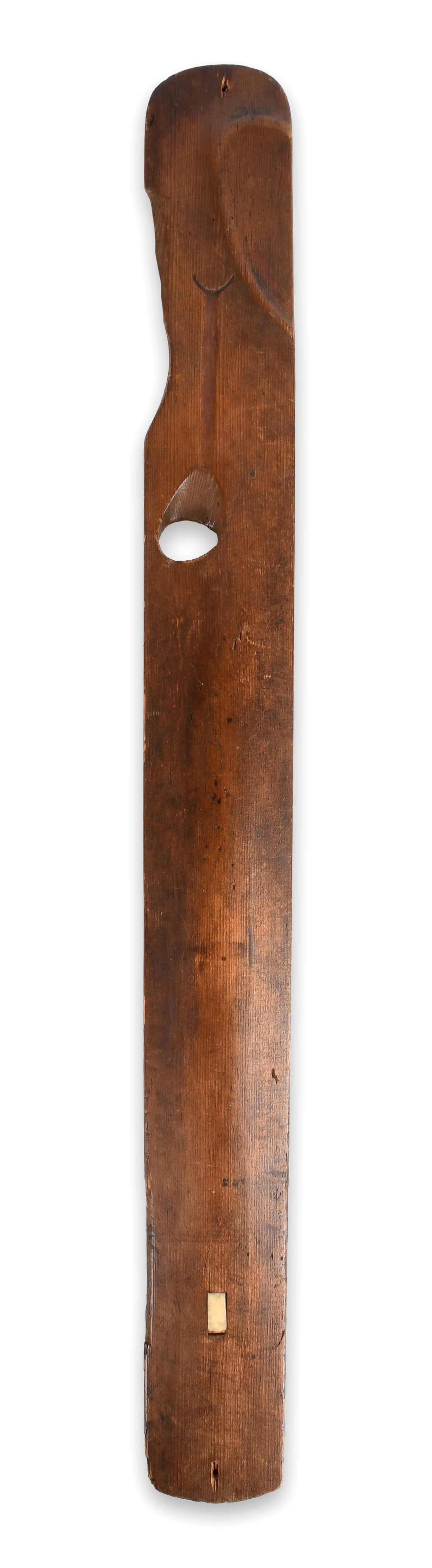 with moulded, carved and pierced decoration with an inset walrus ivory point, the back with a yellow painted inventory number 755 and hand written label Prince William Sound, Alaska, 19th century,