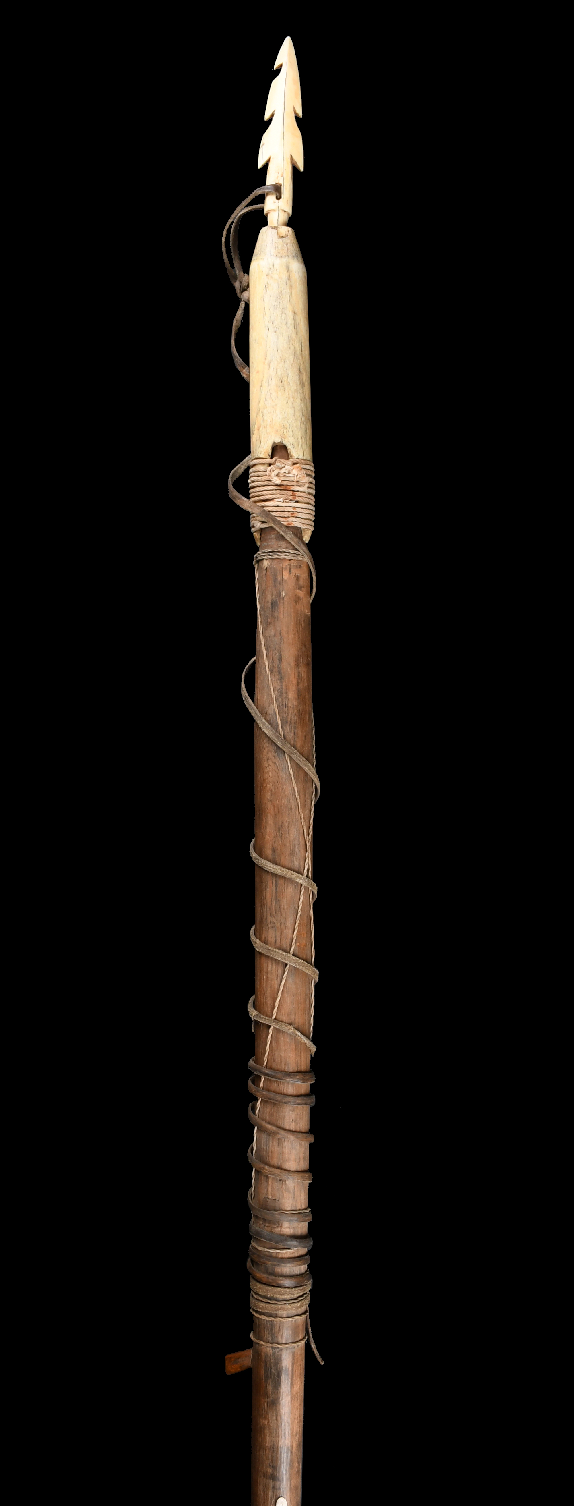 cedar, marine ivory, sinew and fibre, with a bound head and detachable barbed tip, the cylindrical shaft with an inset wood spur, whereafter it flattens, 19th century,