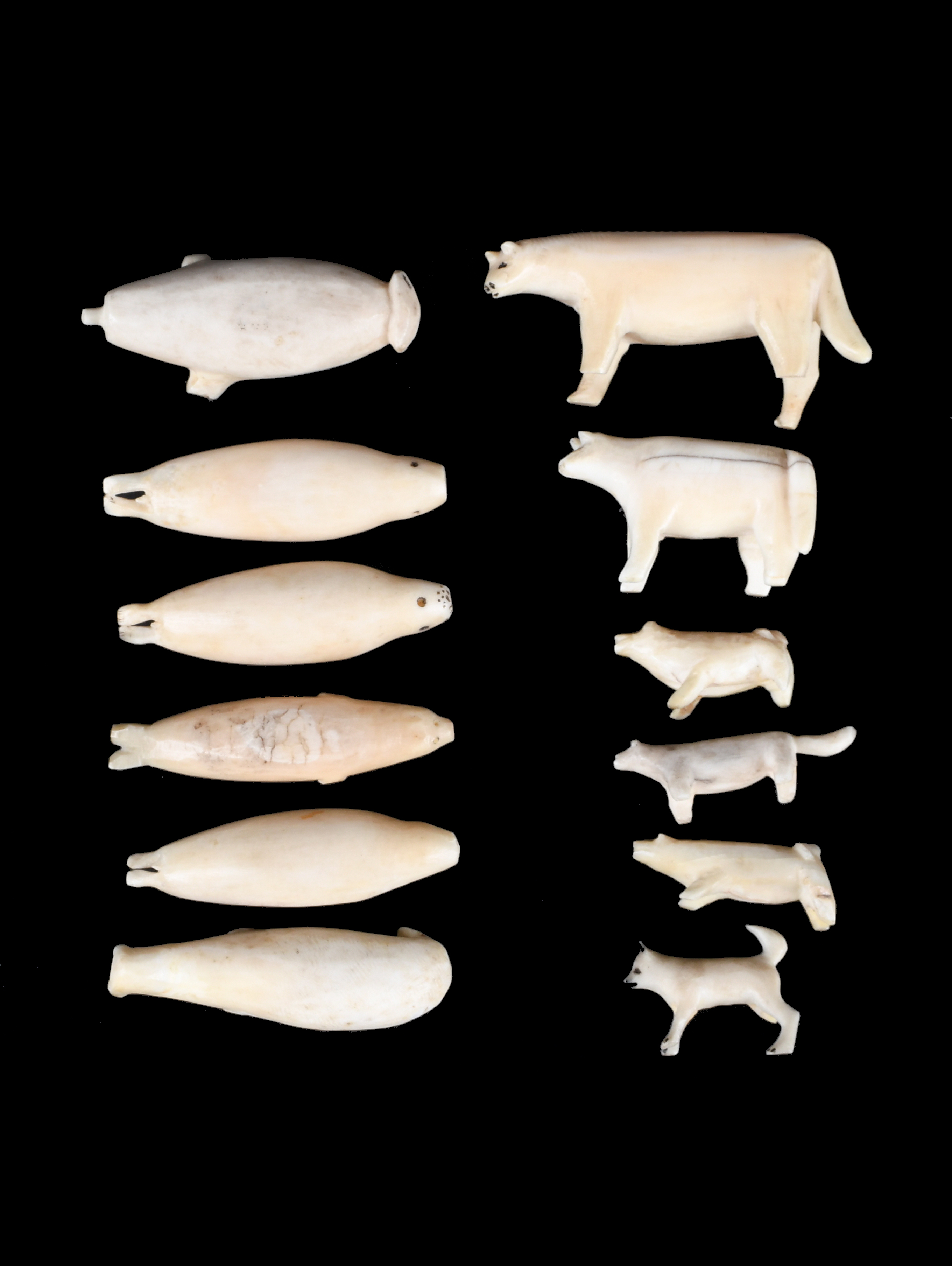 marine ivory, including a walrus, a narwhal, four seals, two polar bears, a fox and three dogs,