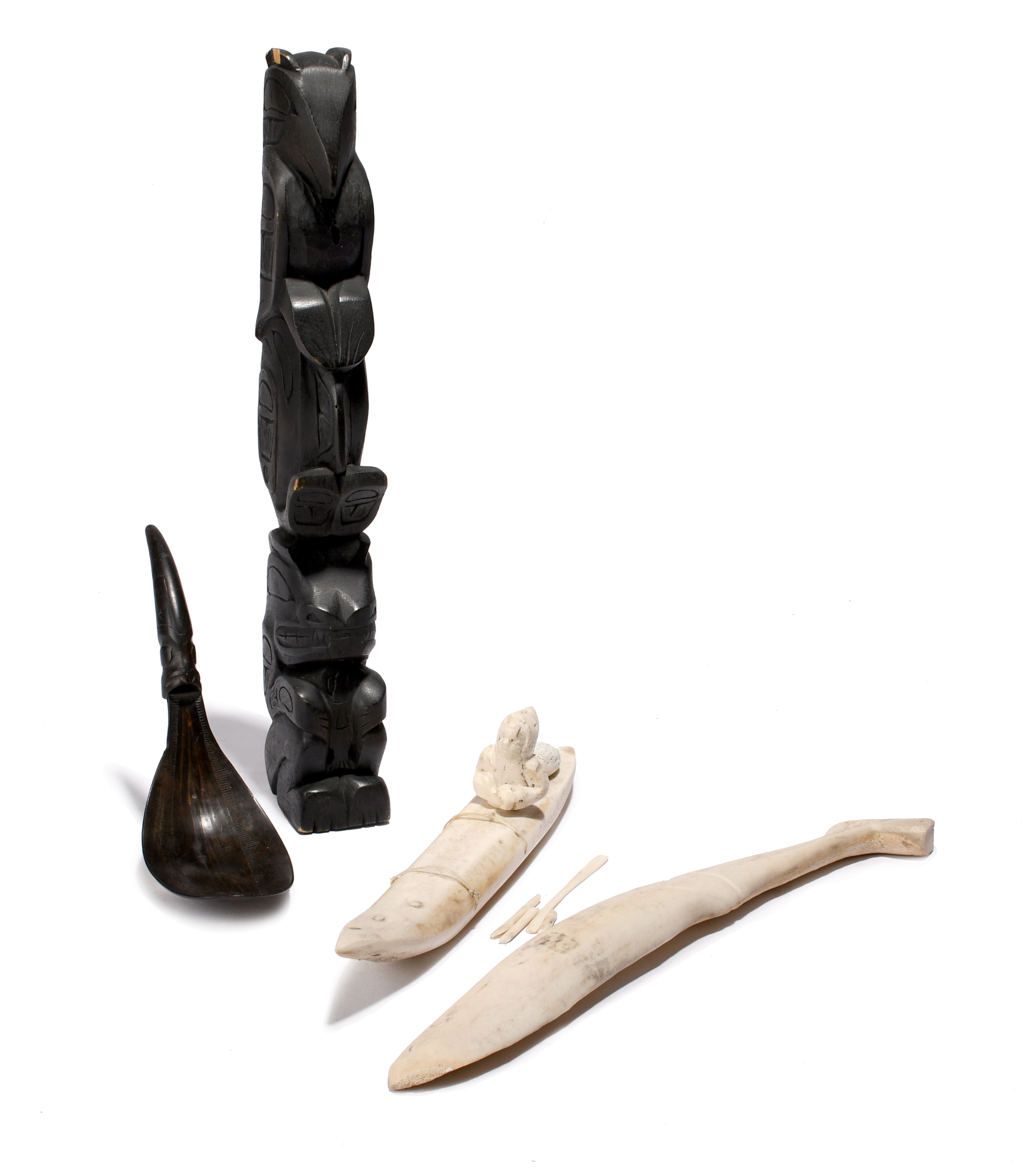 a carved and stained wood model totem signed R. PAUL, 30.6cm high, an Inuit antler model kayak, with hunter and Candian Eskimo Art sticker, 26cm long and an Inuit antler snowknife, 30.5cm long. (10)