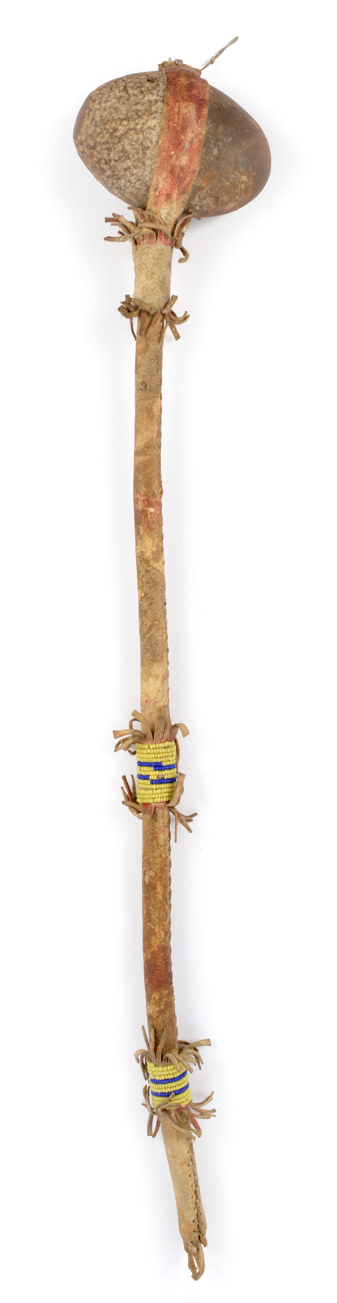 oval with a wood shaft having a hide mount, with tassels, yellow and blue glass beads and red pigment,