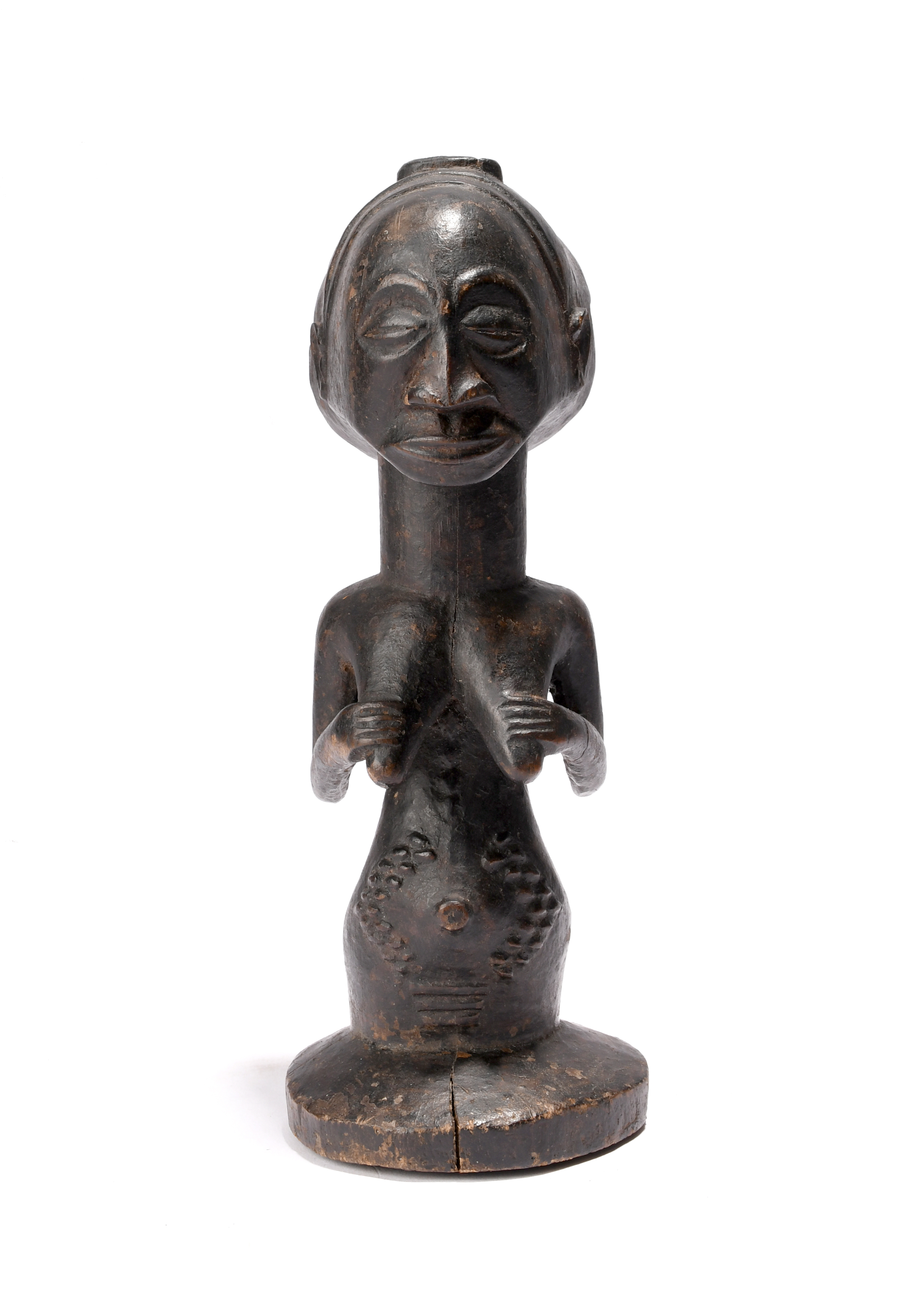 A Luba female half figure Democratic Republic of the Congo with a charge aperture to the crown of...