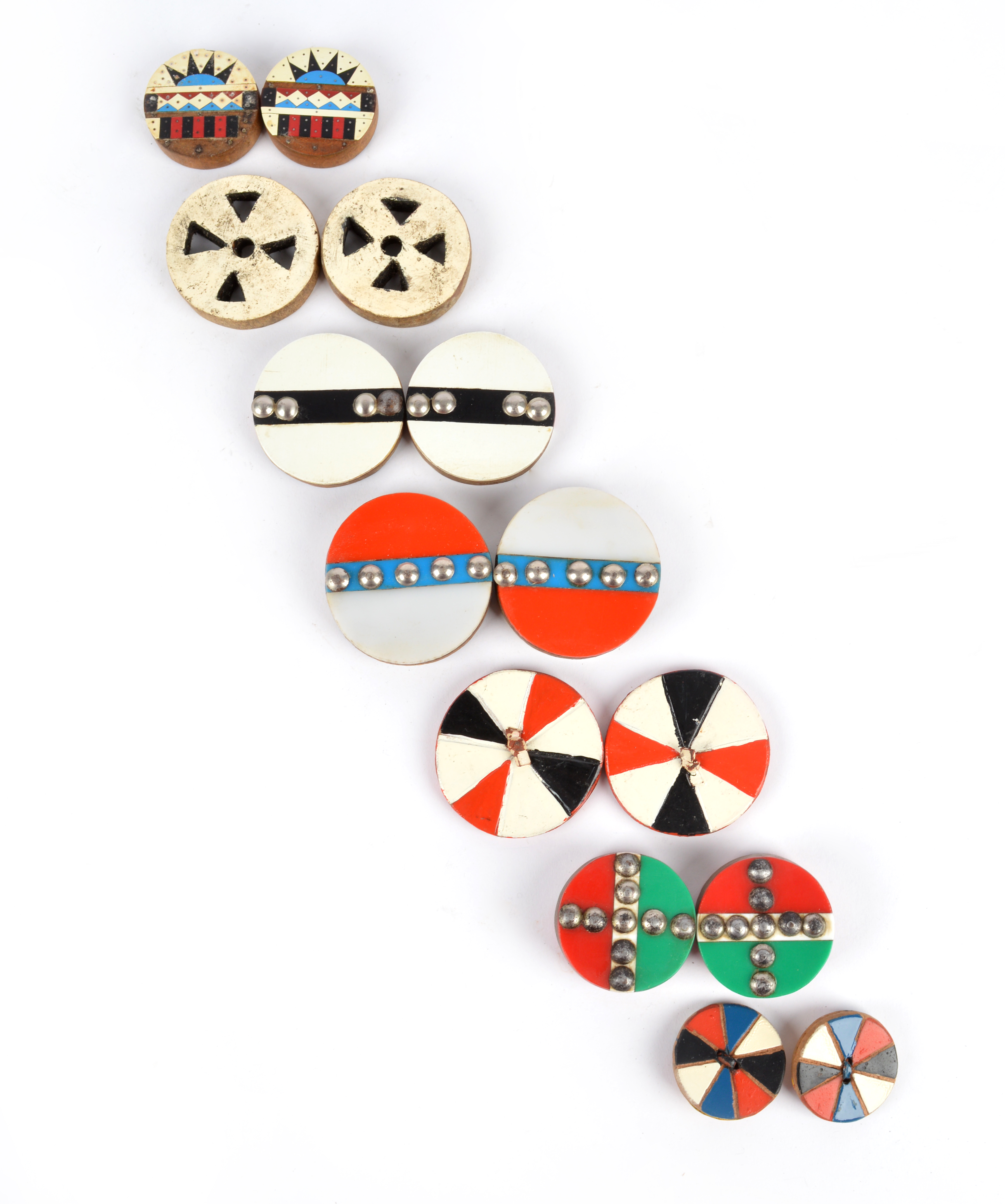 including a pierced pair with white paint, 6cm diameter, three pairs with coloured plastic and tacks, 5cm, 6cm and 6.5cm diameter, one pair with geometric vinyl designs, single sided, 4.5cm diameter, and two pairs of two parts tied together and with painted segments, 4.2cm and 6.4cm diameter. (14)