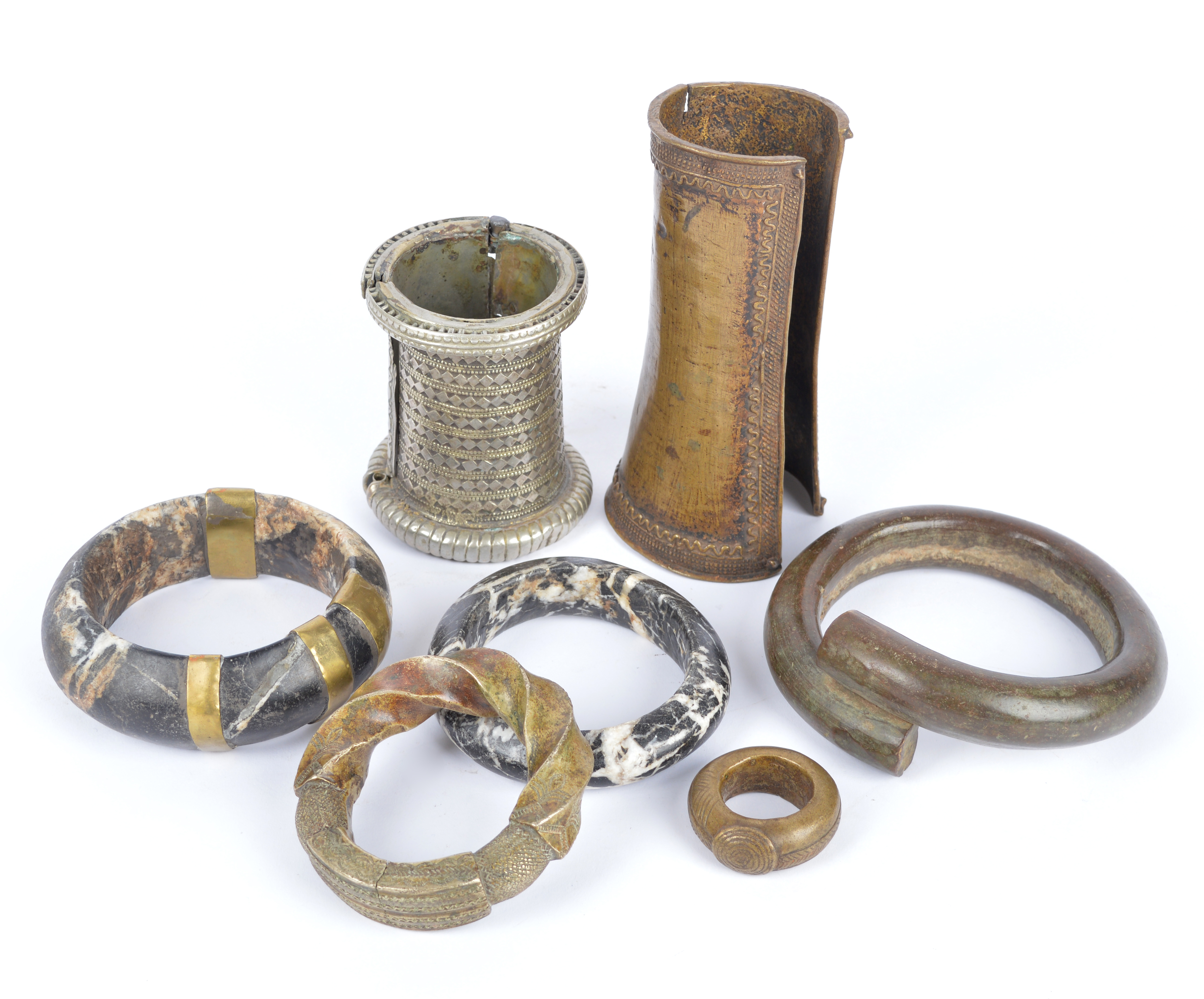 an Ibo bronze currency anklet, a Fulani brass bangle, a Guerre brass currency ring, a Bamileke brass cuff bracelet and a Nubian bracelet. (7)