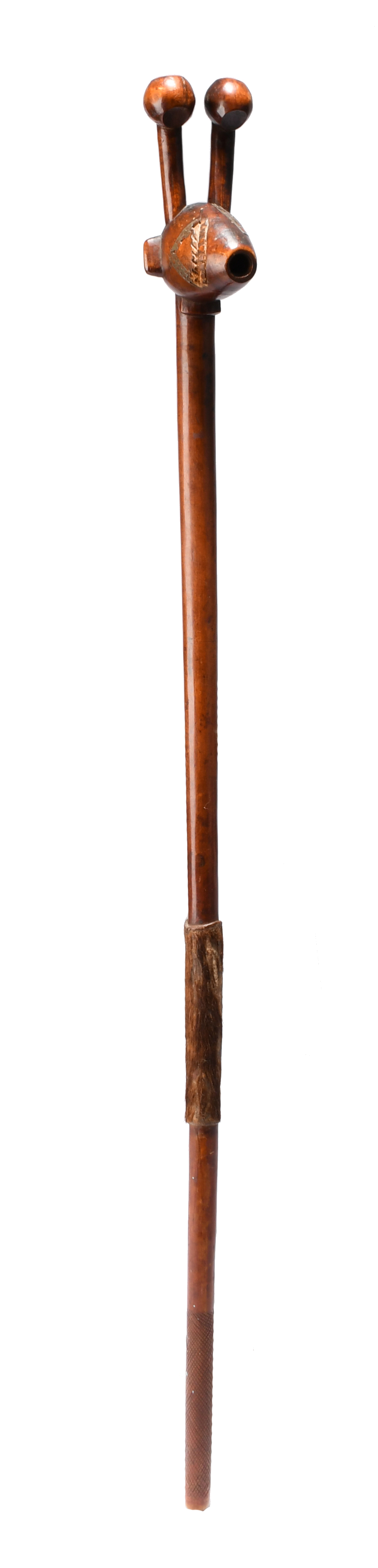 the bovine head snuff container with inlaid pewter and two miniature kerries as horns, the shaft with a hide binding and a carved hatching to the handle,