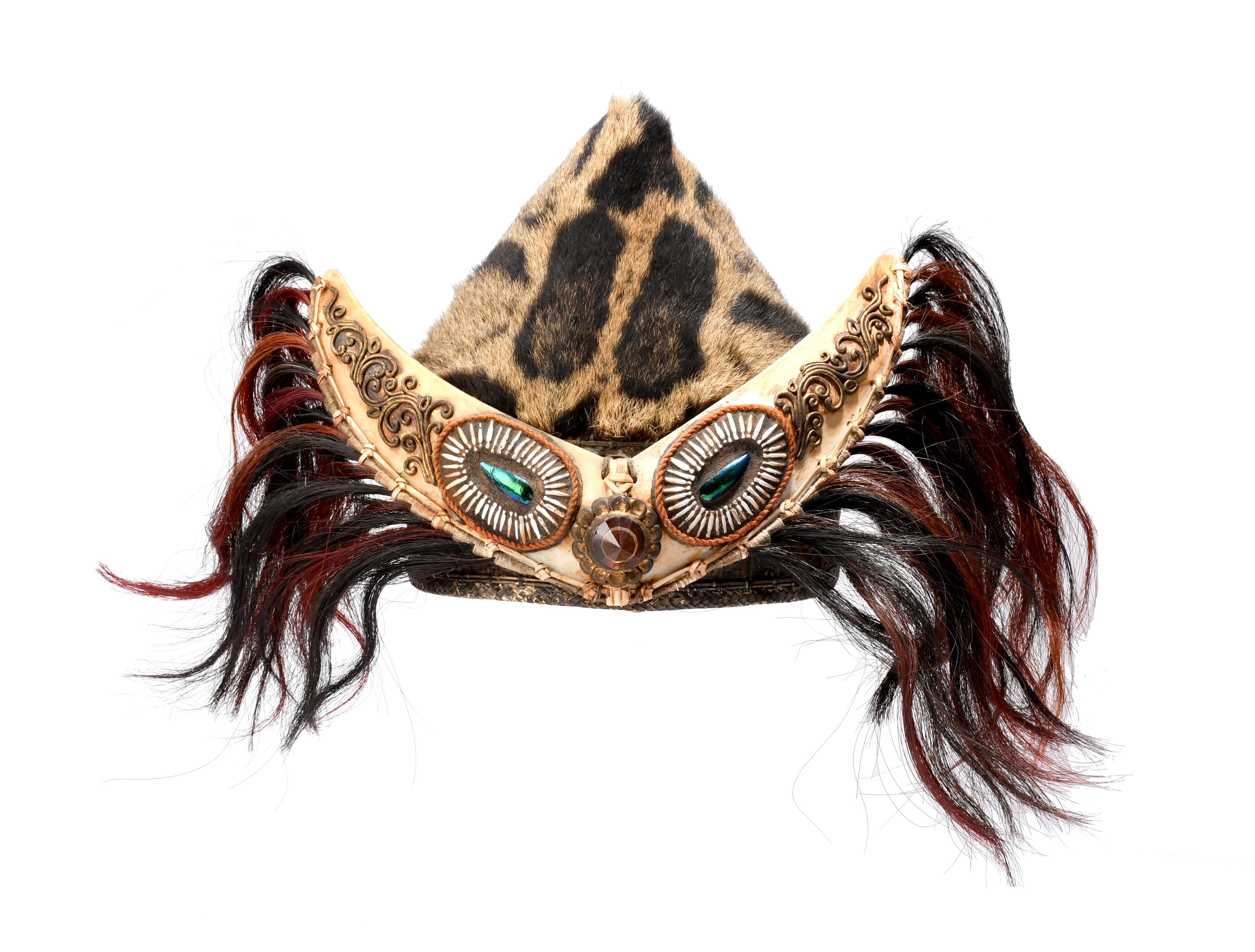 rattan, fibre and clouded leopard (neofelis nebulosa) skin with applied bone horns with applied 'tiger eye's' of shell and beetle elytrae, gilt mounts and central facet glass bead, edged with natural and red stained horse hair, early - mid 20th century,