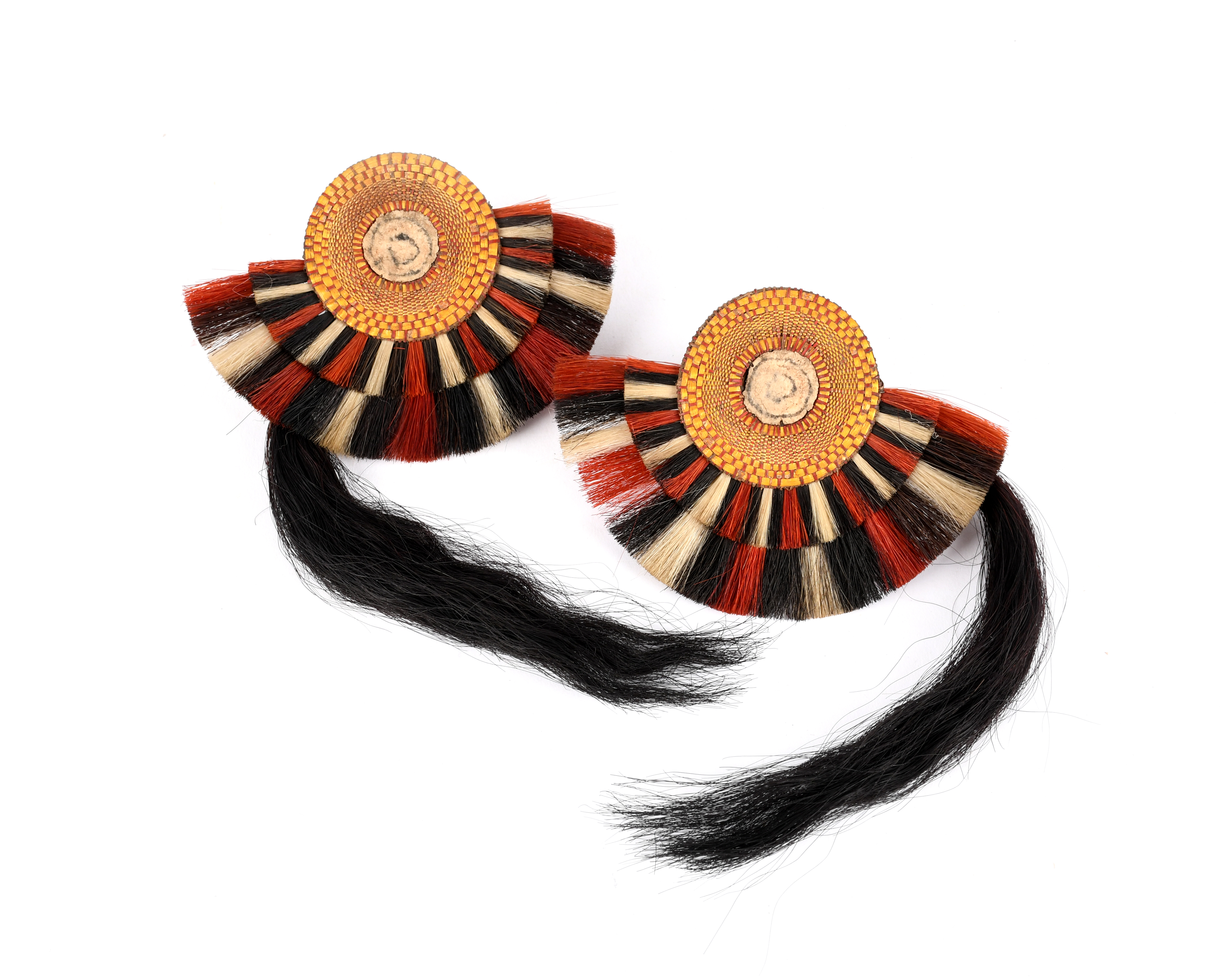 A pair of Naga ear ornaments Nagaland natural and dyed cane and animal hair