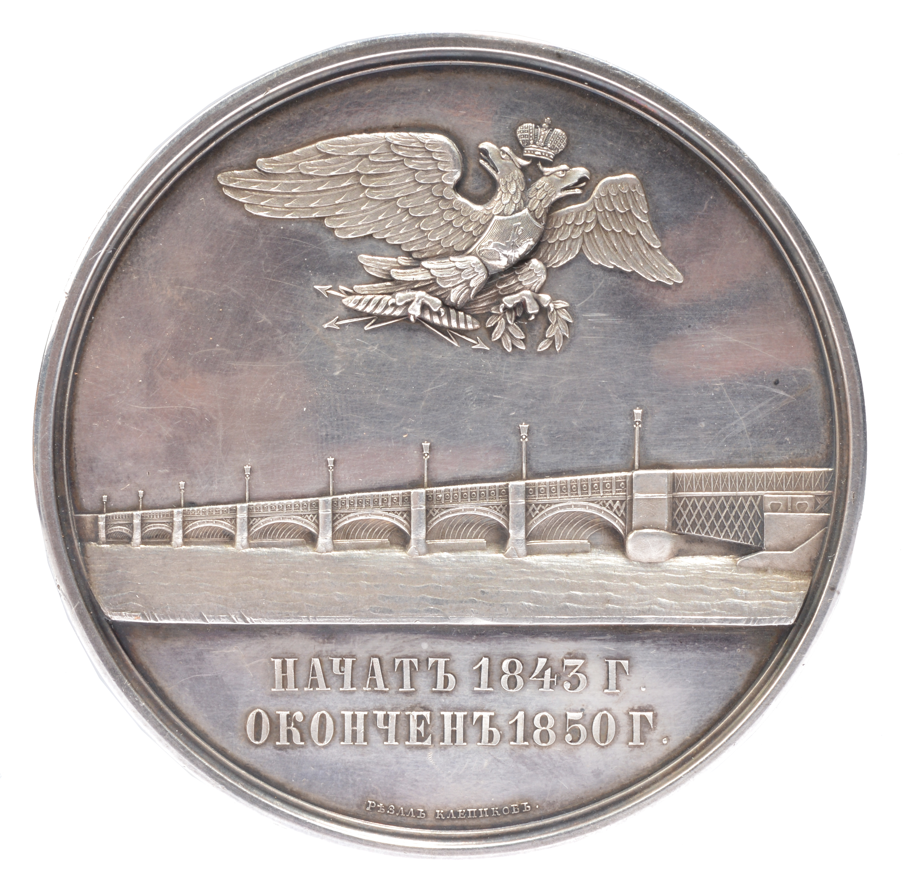 Imperial Russia: Nicholas I, Completion of the Blagoveschensk Bridge 1850, a silver medal by A. Klepikov and A. Lyalin, 75 mm, the bridge with Imperial Eagle overhead, rev. Hercules and Minerva bridging, with his club, a stream proceeding from the mouth of a jar, against which a female figure reclines with a spade, cased, extremely fine or nearly so.