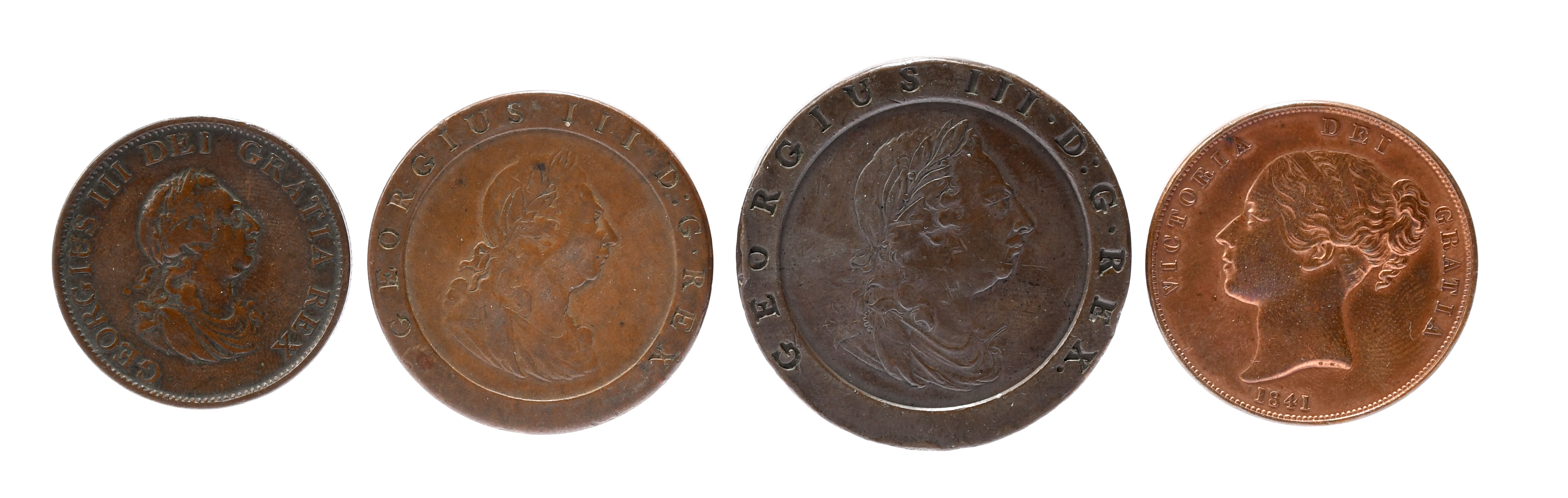 George III, copper two pence and penny, 1797, Soho Mint (S 3776 and 3777), very fine and good fine; half penny 1799 (S 3778), good fine or better; and Victoria, copper penny, 1841, ornamental trident, no colon after REG (S 3948), nearly extremely fine. [4]