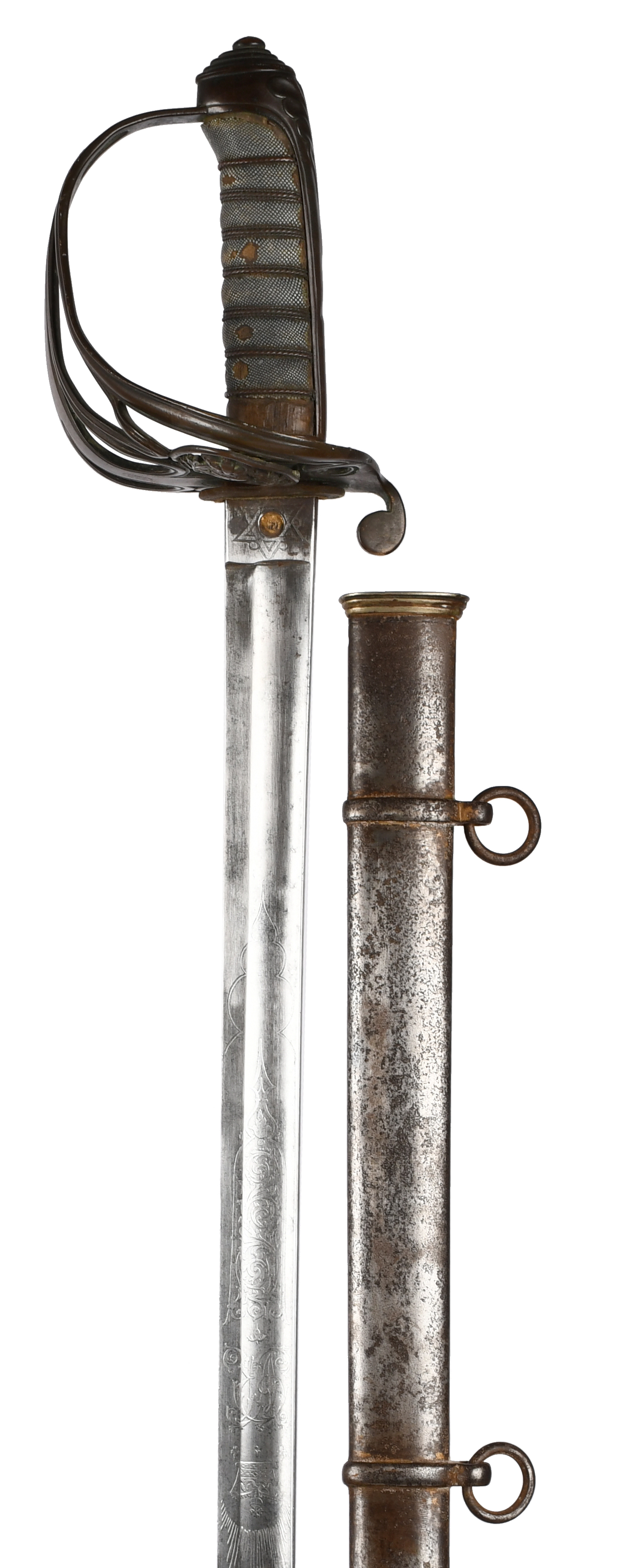 A British 1854 pattern staff officer's sword, fullered blade 33 in., by Henry Wilkinson and numbered 22526; brass 'gothic' hilt with crossed sword and baton to the cartouche; steel scabbard.