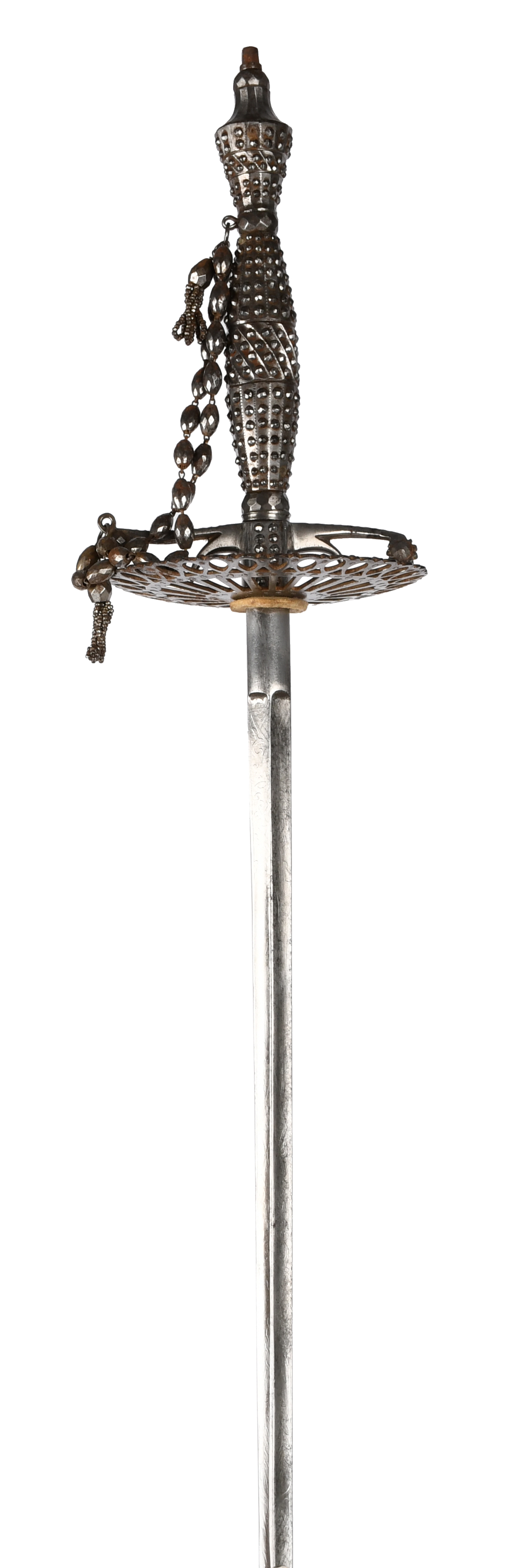 A British court sword, slender hollow triangular section blade 31.5 in., cut steel hilt with pierced oval guard and two strands of faceted beads between the top of the grip and the front quillon.