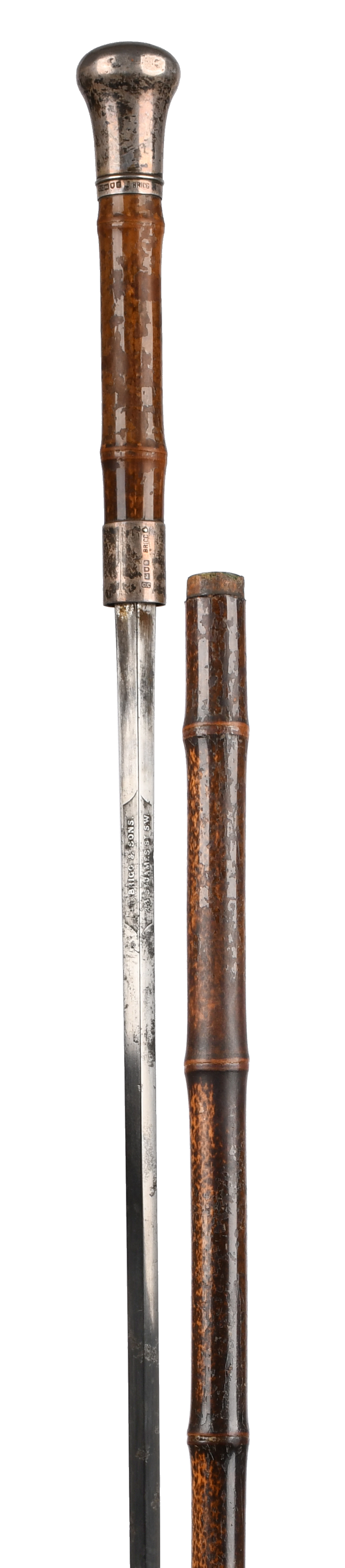 A silver mounted sword stick, by T. Brigg & Sons, 23 St James Street, slender diamond-section blade 28 1/2, bamboo cane, silver collar and top (London, 1903), the top engraved 'R.B. from W.W.K.'.