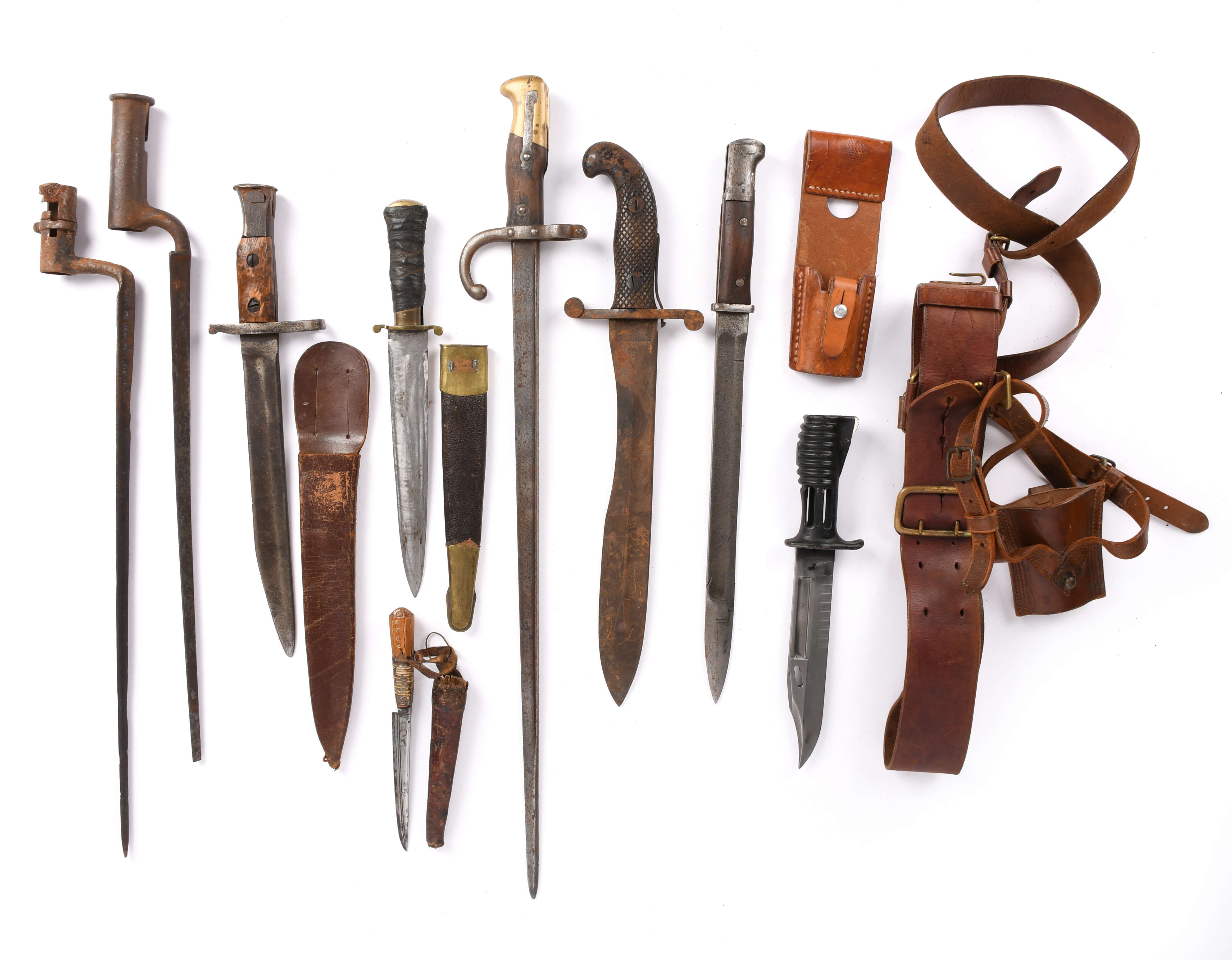 A quantity of bayonets and other items, including: a Spanish M1907 artillery bolo (machete), four various socket bayonet, three British L3A1 bayonet, four full length frog for the corresponding scabbard, a Ross bayonet (a/f), a Lancaster pattern bayonet (a/f), a Sam Browne belt with sword frog, a pair of cavalry spurs, and other items. [qty]