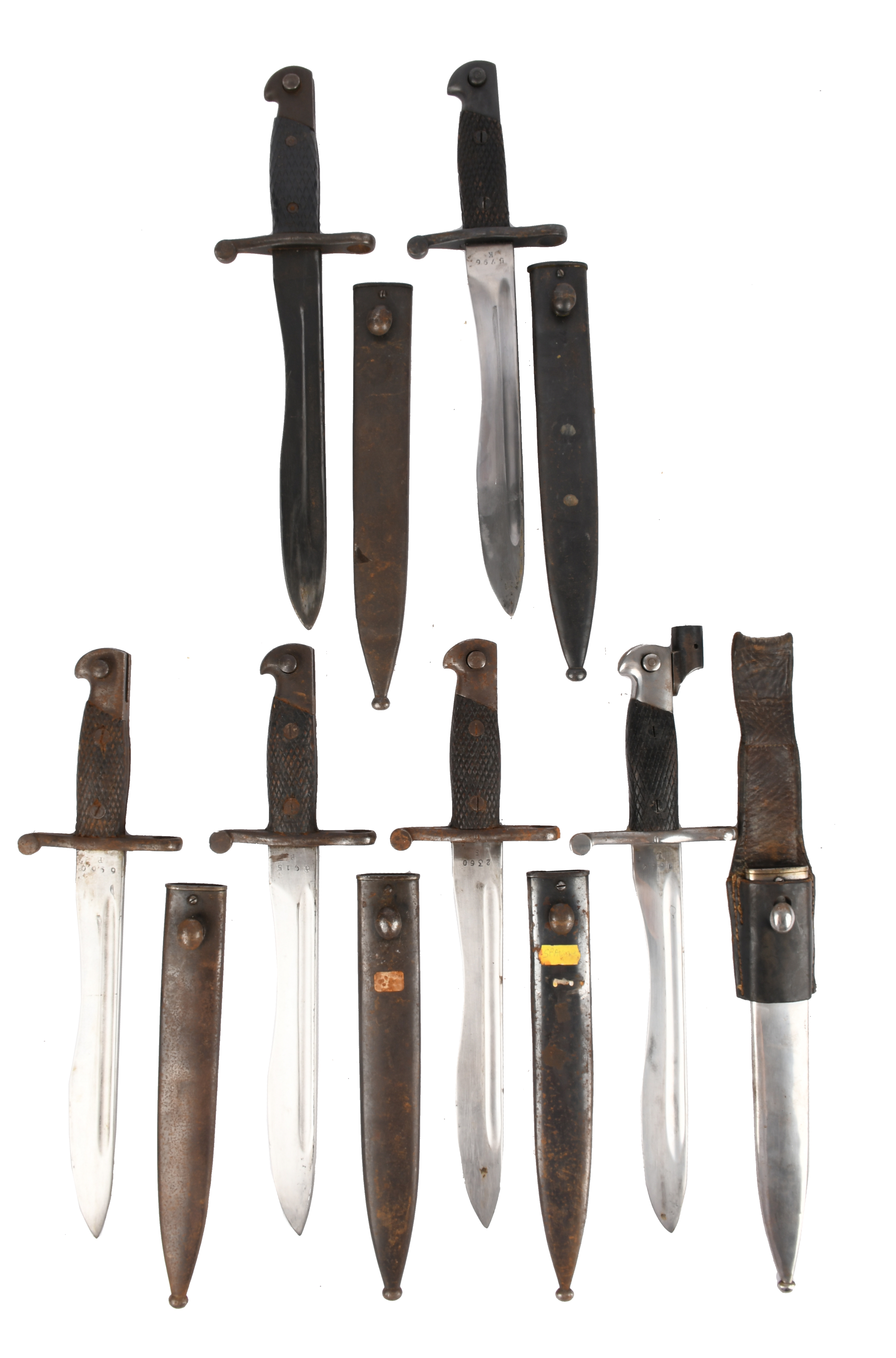 Six Spanish model 1941 bayonets, heavy bolo type blades, various grip materials, steel scabbards (three with serial numbers matching their blades), one with a leather frog, one bayonet retaining a Ricchieri adapter in the mortise slot. [6]