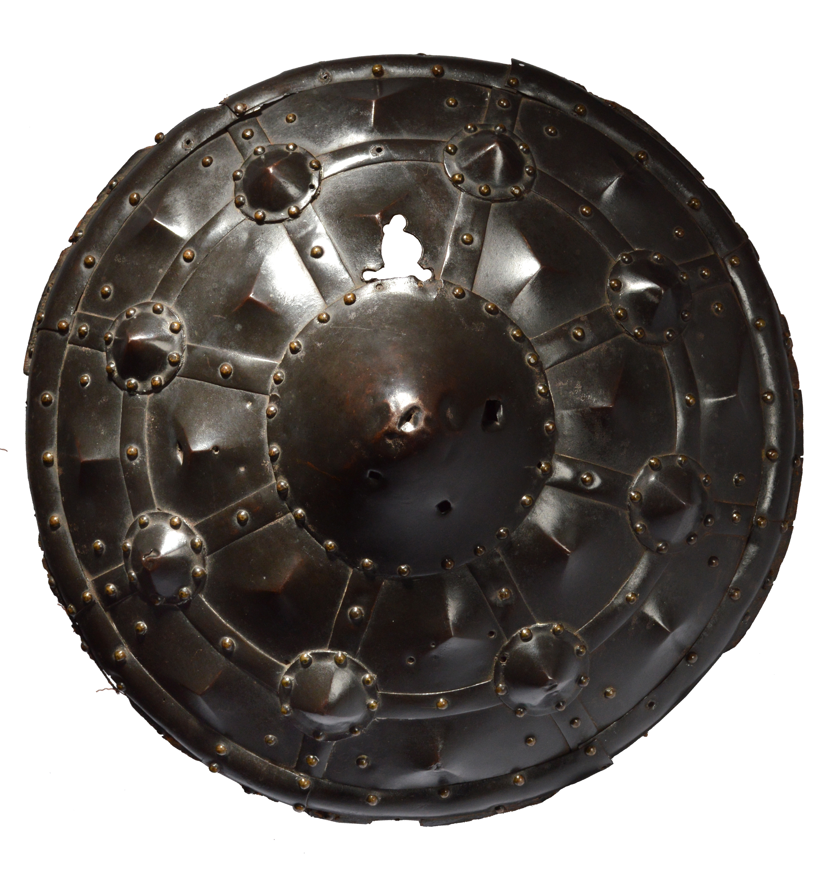 Henry VIII of England: a rare and historically important gun shield. A convex circular shield, or target, composed of two layers of wooden strips laid at right angles, faced with two concentric tiers of eight ferrous plates each formed with a shallow tetrahedral peak and arranged around a large conical central boss, the joints between the plates covered with iron straps at the junctions of which are set eight smaller conical bosses, the rim covered by a further strap of domed section, straps and bosses fixed with cuprous headed iron nails, the upper plate of the inner tier with an aperture for a match lock pistol (not present), the inner face retaining the stubs of leather straps and with traces of fibrous matter and other residual indications of backing materials and fittings, diameter 52 cm, 16th Century.