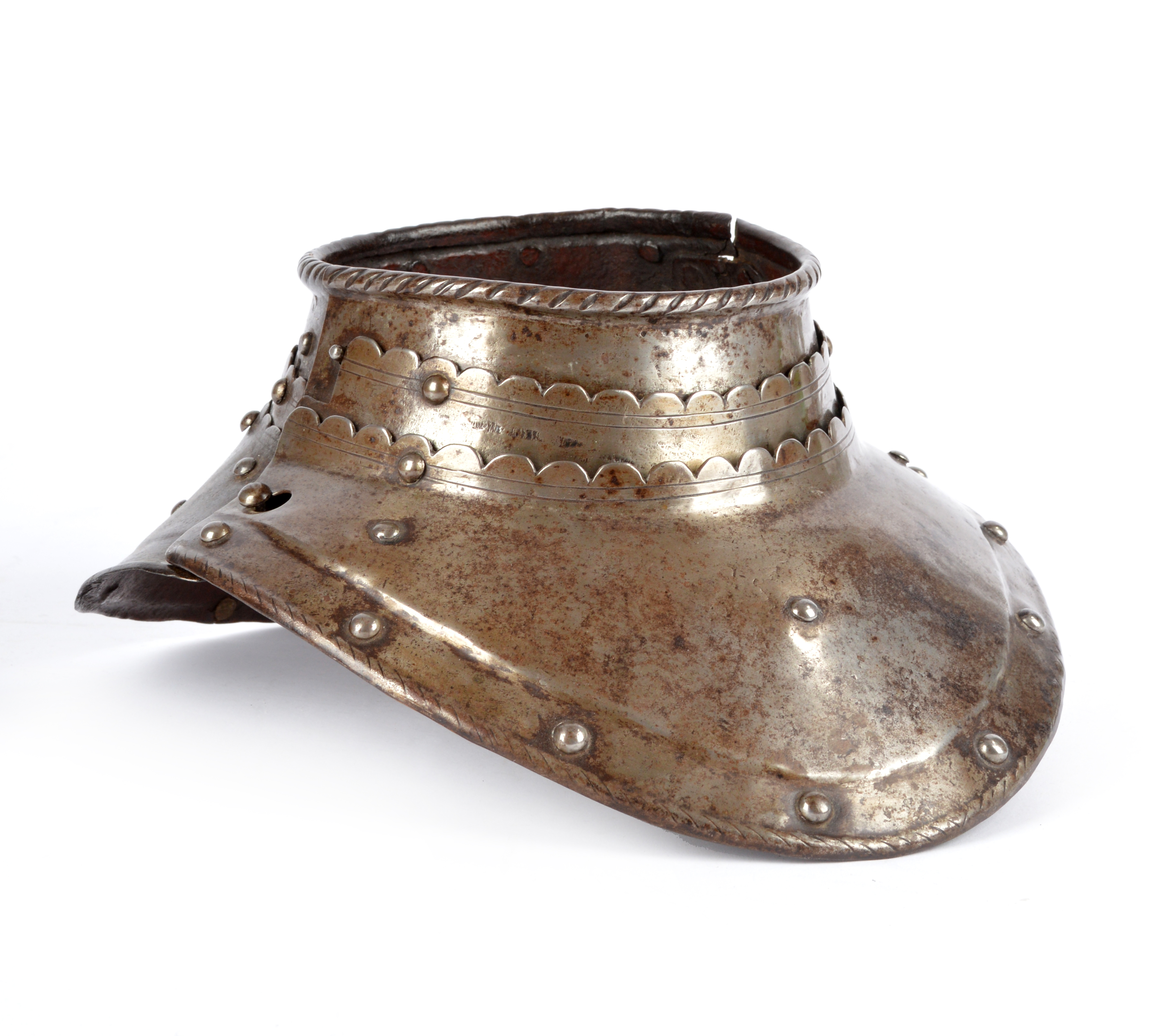 A gorget, composed of large shaped plates front and rear with recessed borders, roped lower and scalloped upper edges; the neck covered by two circular lames, the lower with scalloped edge and the upper roped; flexibility accomplished by rivets riding in vertical slots, the whole assembly hinged at the left of the upper lame, and secured at the right by a post and hole to the upper lame, and a stud locking into a shaped hole on the lower plates; in the manner of the late 16th century and thought to be of the period.