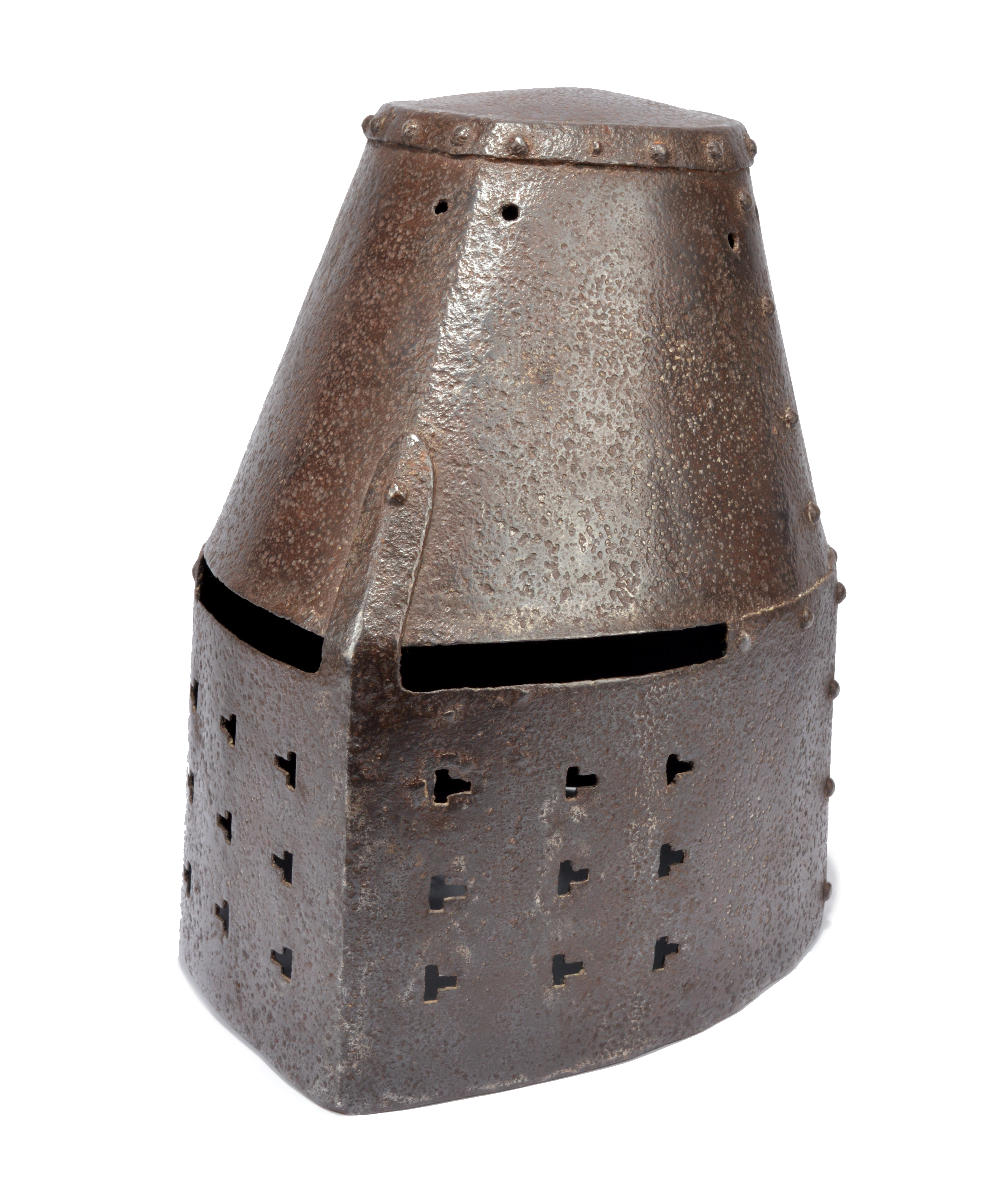 A great helm, of riveted construction, conical crown formed of two plates - the front with medial ridge and lower edge slightly flared out above two vision slits, slightly domed oval top, two further plates covering the lower head and face, the front ventilated with 18 key shaped perforations and with the upper rim reduced to form the two vision slits with a vertical strap between riveted to the upper plate, height 33 cm (13 in.), in the manner of the late 13th Century but believed to be 19th Century.