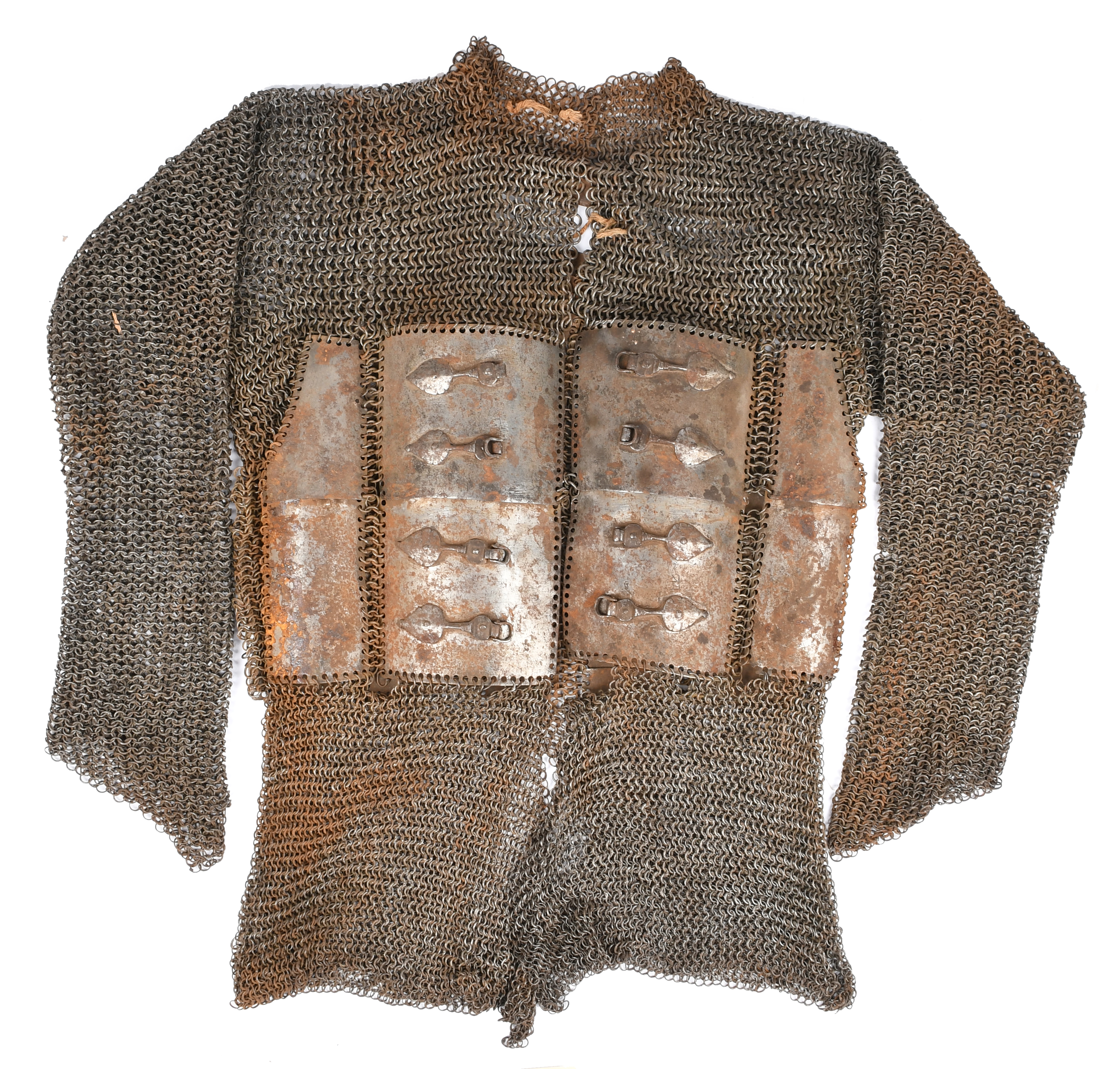 An Indian shirt of mail and lamellar armour, constructed of alternating rows of welded and riveted links, the back incorporating three vertical rows of overlapping rectangular plates, further larger plates protecting the flanks, the front set with two pairs of large curved plates on each side of the central opening, each fitted with looped brackets for fastening straps, full length sleeves, hem slitted at rear.