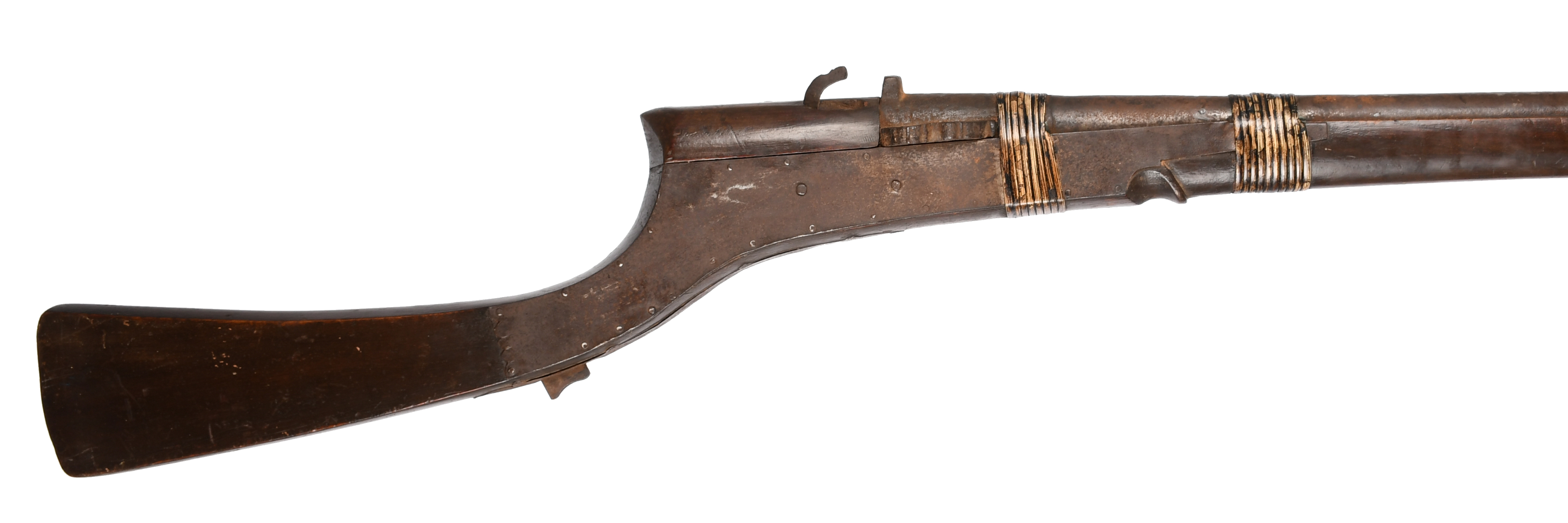 An Indian matchlock rampart gun, heavy barrel 42 in., approximately 10 bore; full stock with steel side plates and characteristic narrow butt.