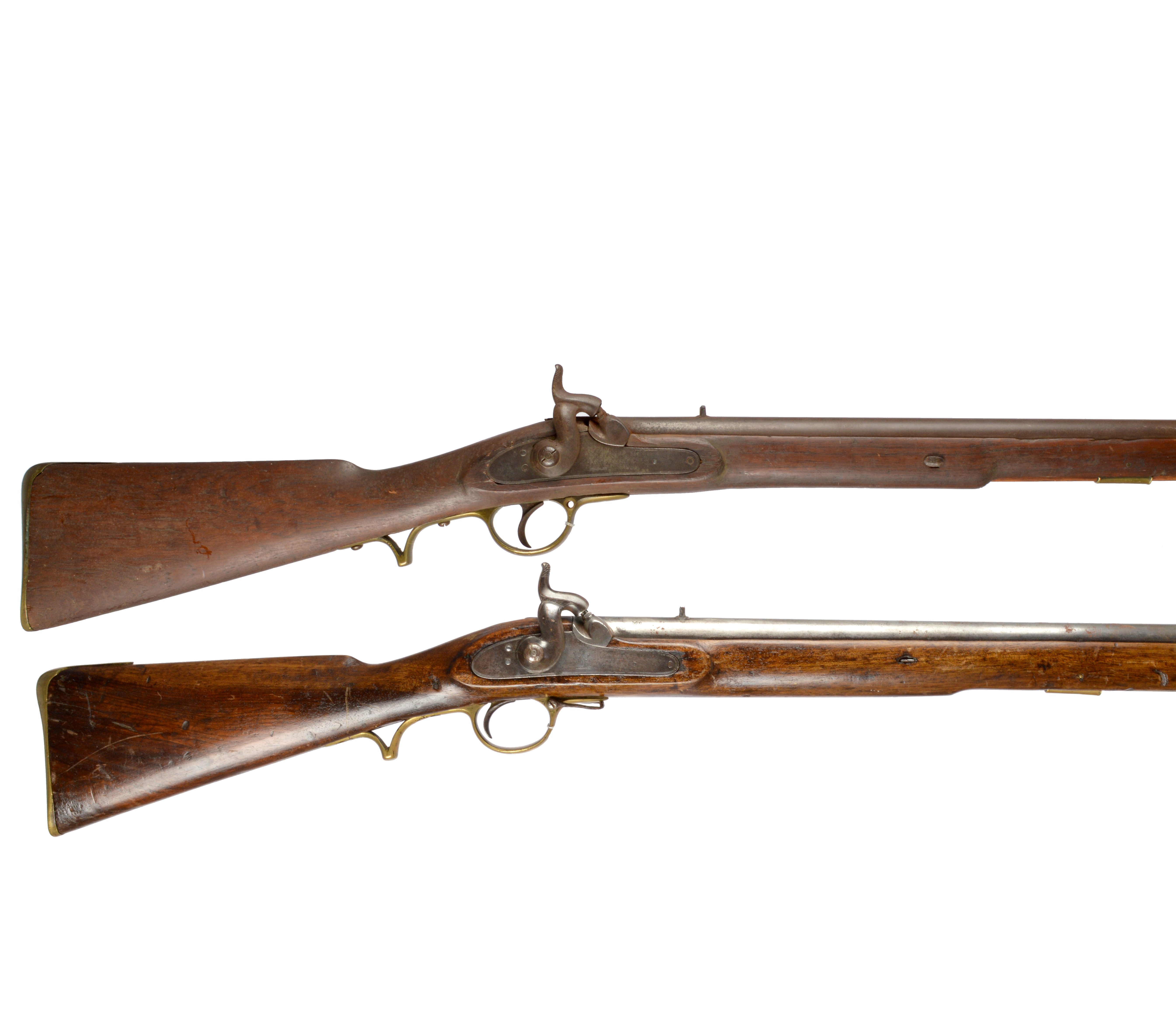 An Indian percussion musket, barrel 38 in. with notch rear sight, lock engraved with H.E.I.C. type lion, full stock with brass furniture and sprung bayonet catch; together with another similar musket, lock marked in the same manner. [2]
