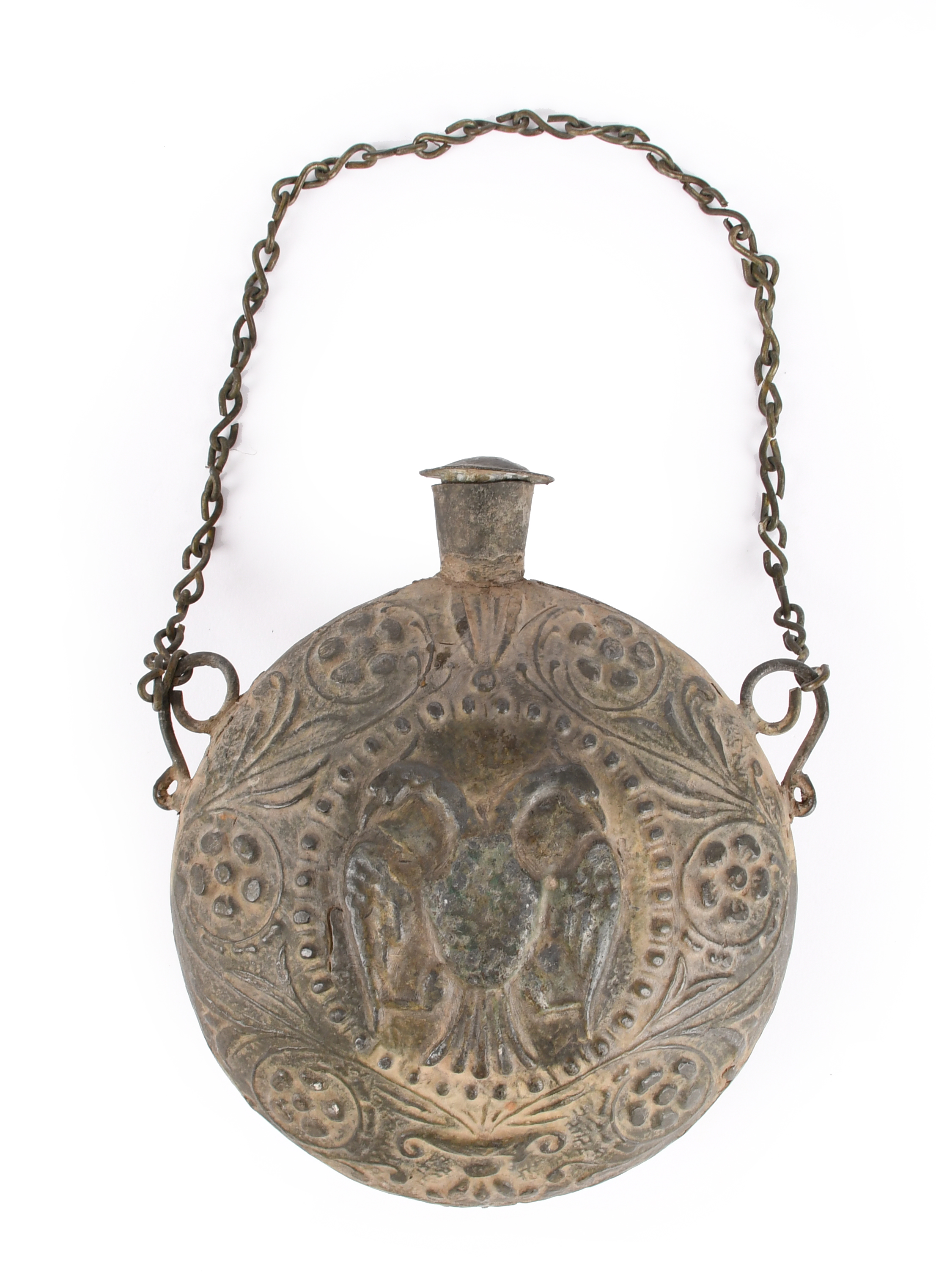 An unusual lead powder flask, round body with moulded decoration, the central device being a double headed eagle, possibly the Habsburg emblem, lead stopper, diameter approximately 12 cm.