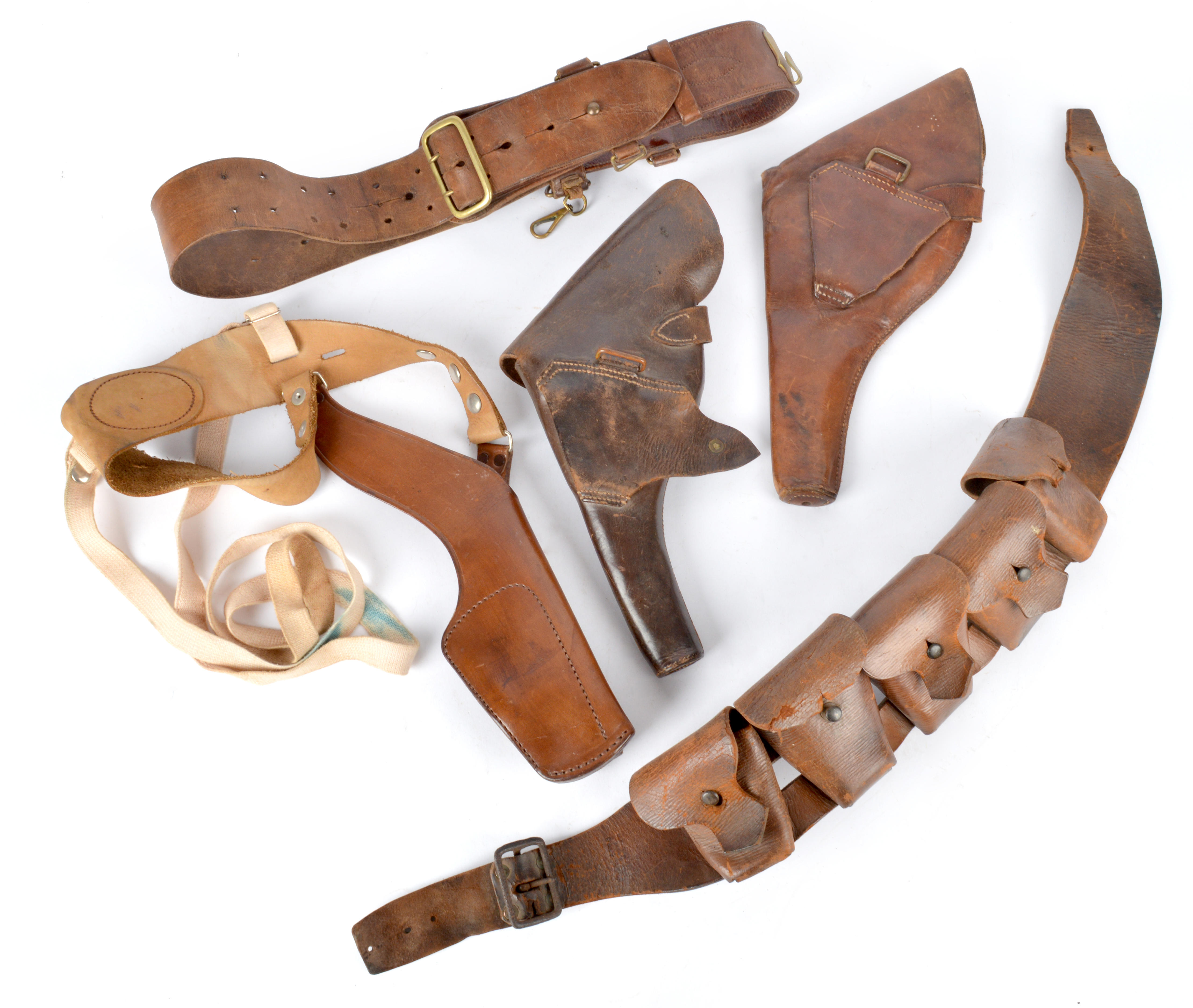 Two British service revolver holsters, a modern leather shoulder holster, a part .303 bandolier, and the waist part of a Sam Brown belt. [5]